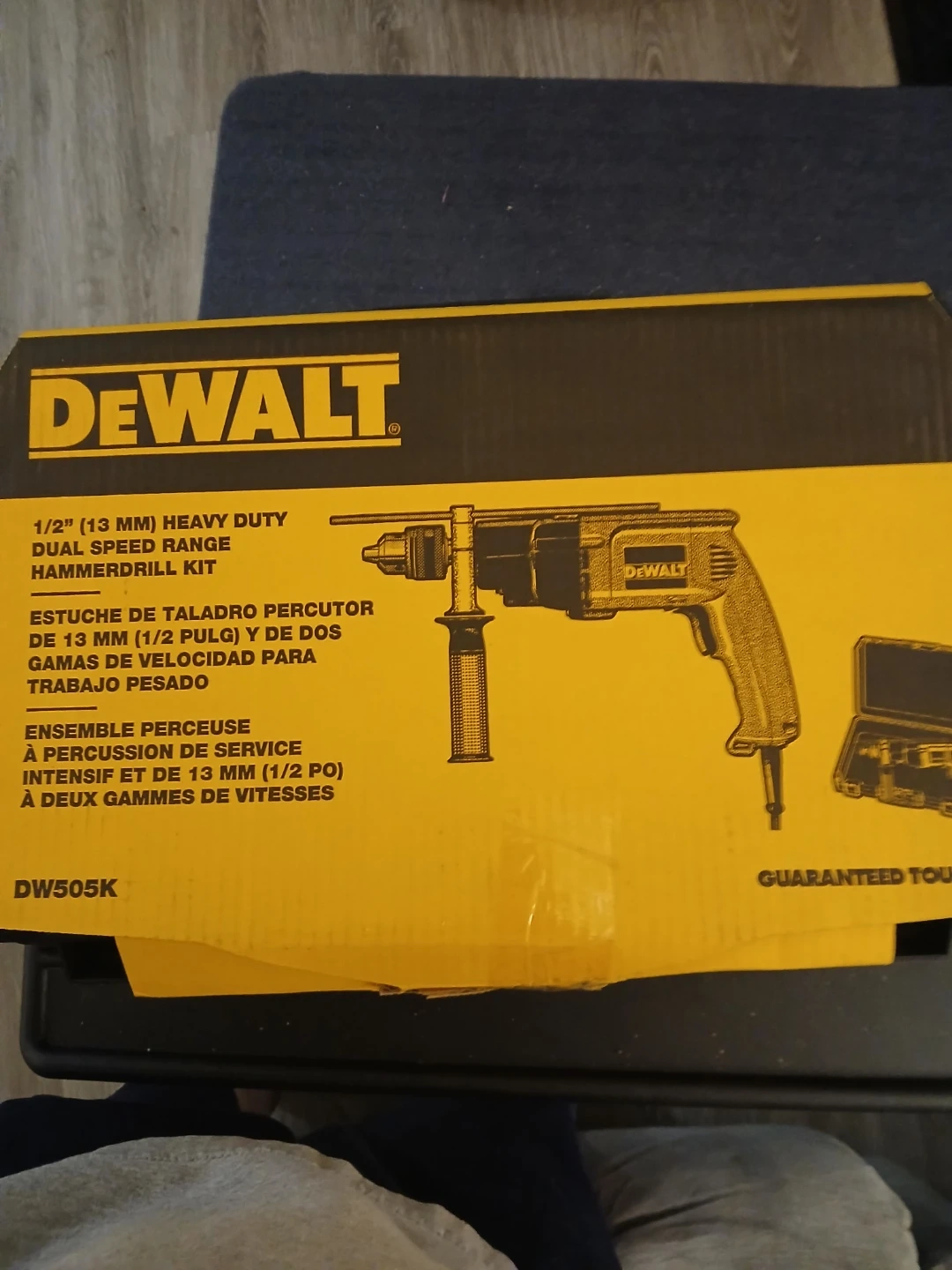 This is a DEWALT 1/2" heavy-duty hammer drill kit. It features a dual speed range for versatile use. Includes the drill and a case with accessories.