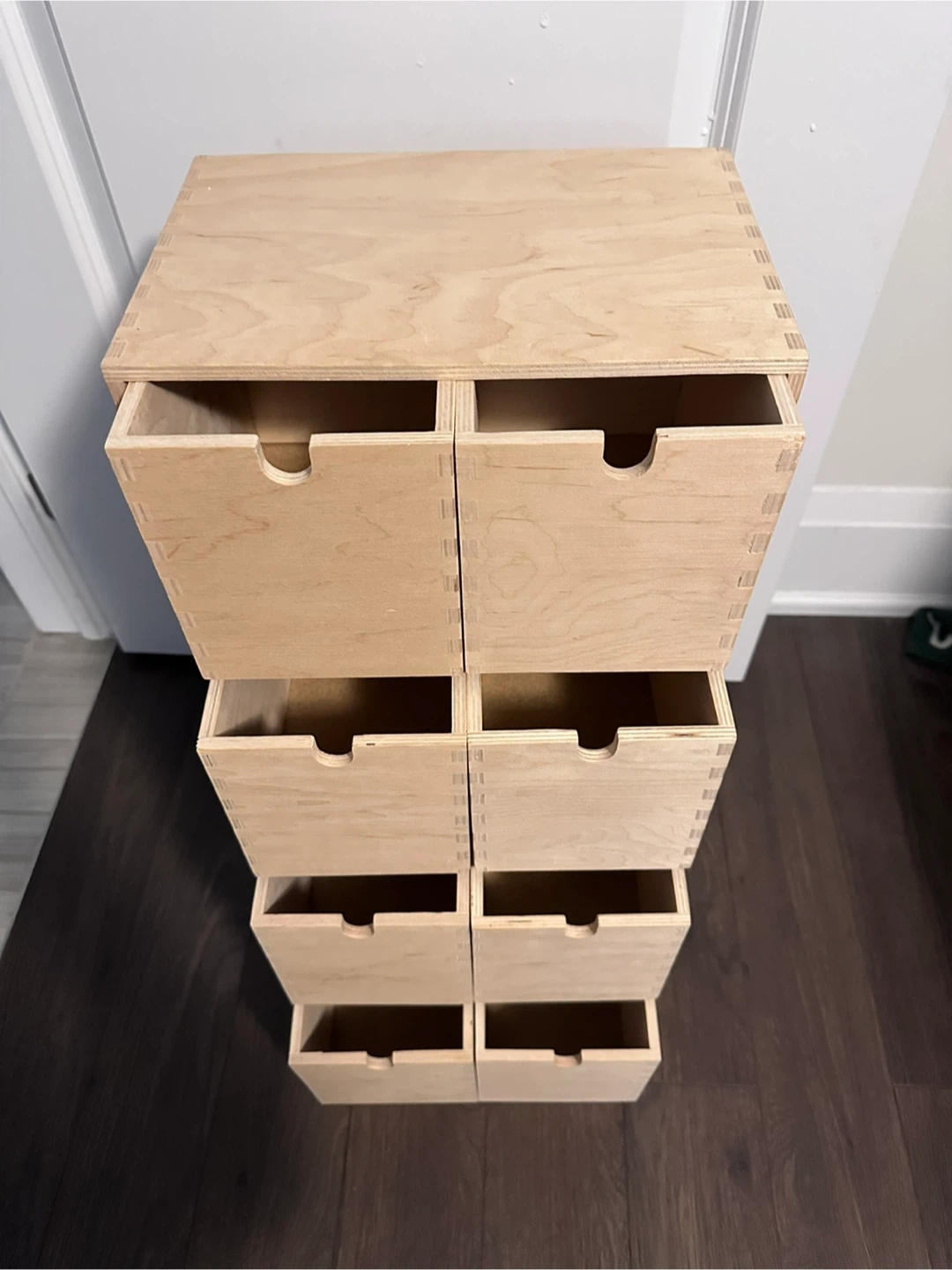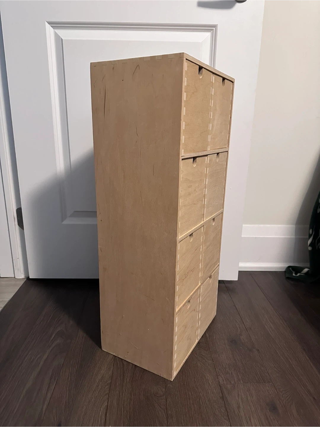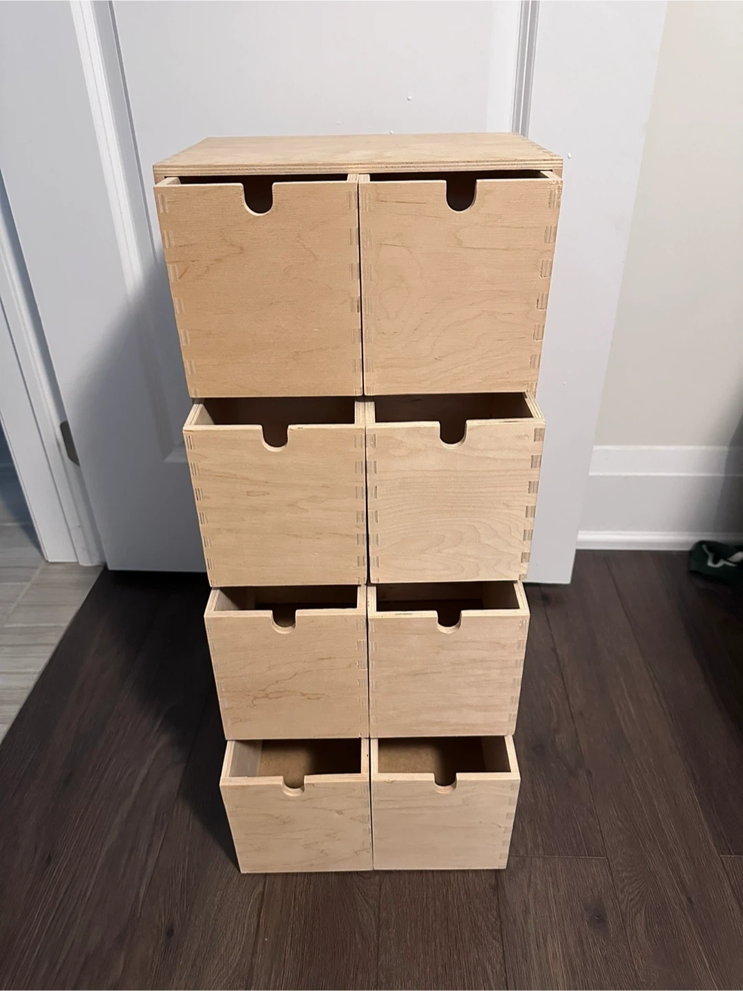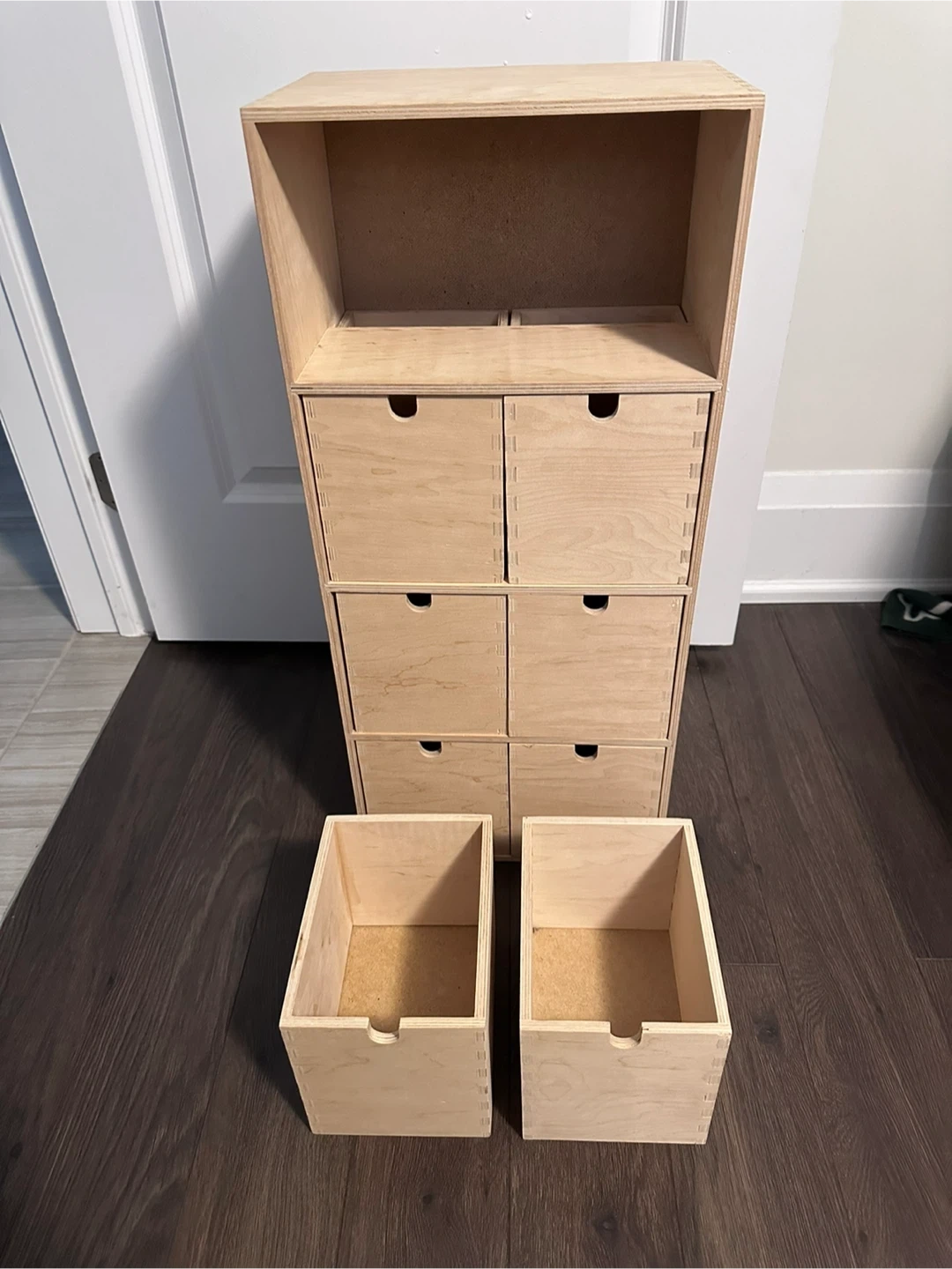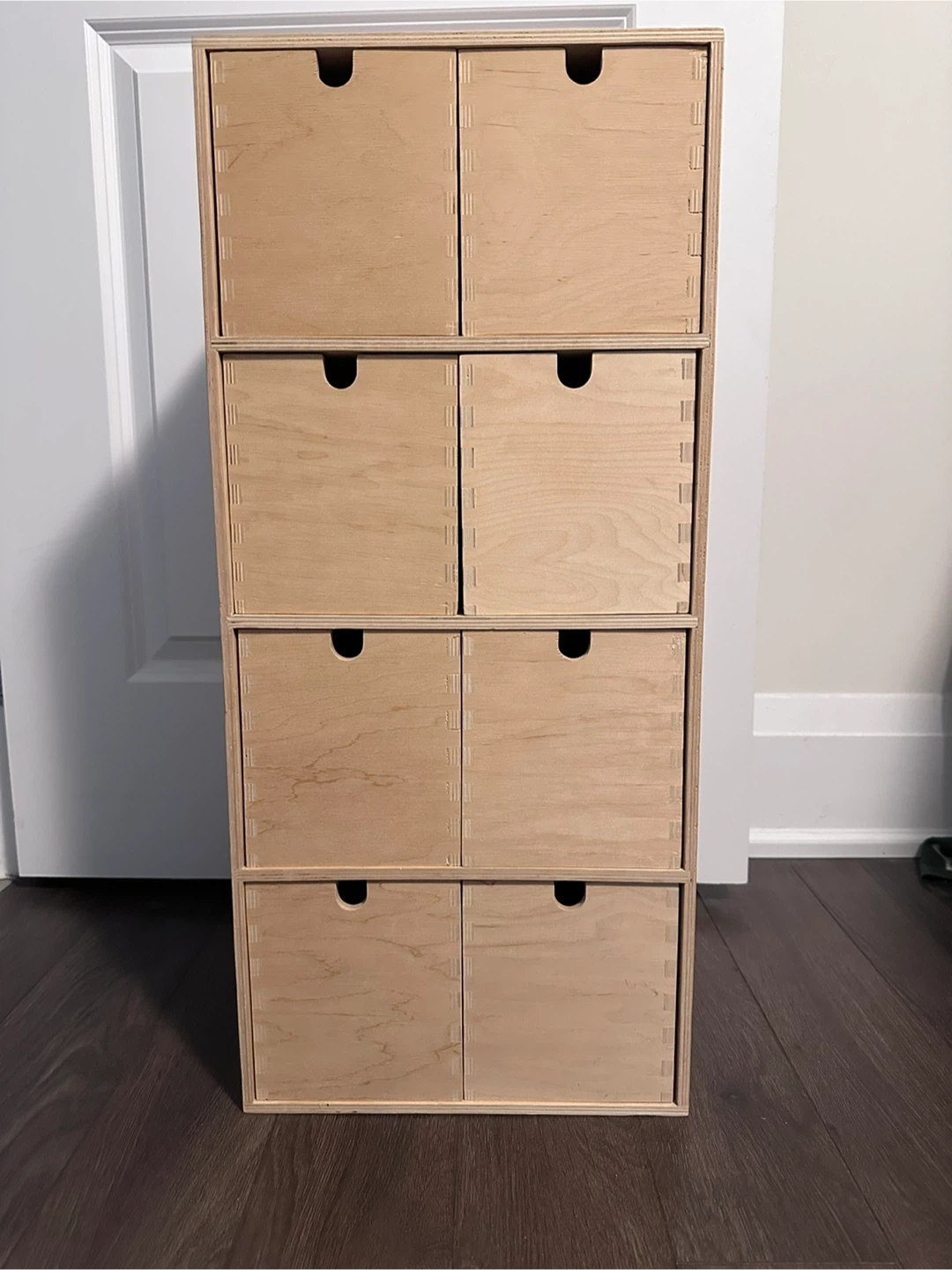 Excellent like new condition wooden storage unit with eight drawers. The unit is made of light-coloured wood. It's great for organizing small items. Size: 30.5 cm L x 29.5 cm D x 68 cm H. Each drawer size is 14.5 cm x 19 cm x 16 cm H.
