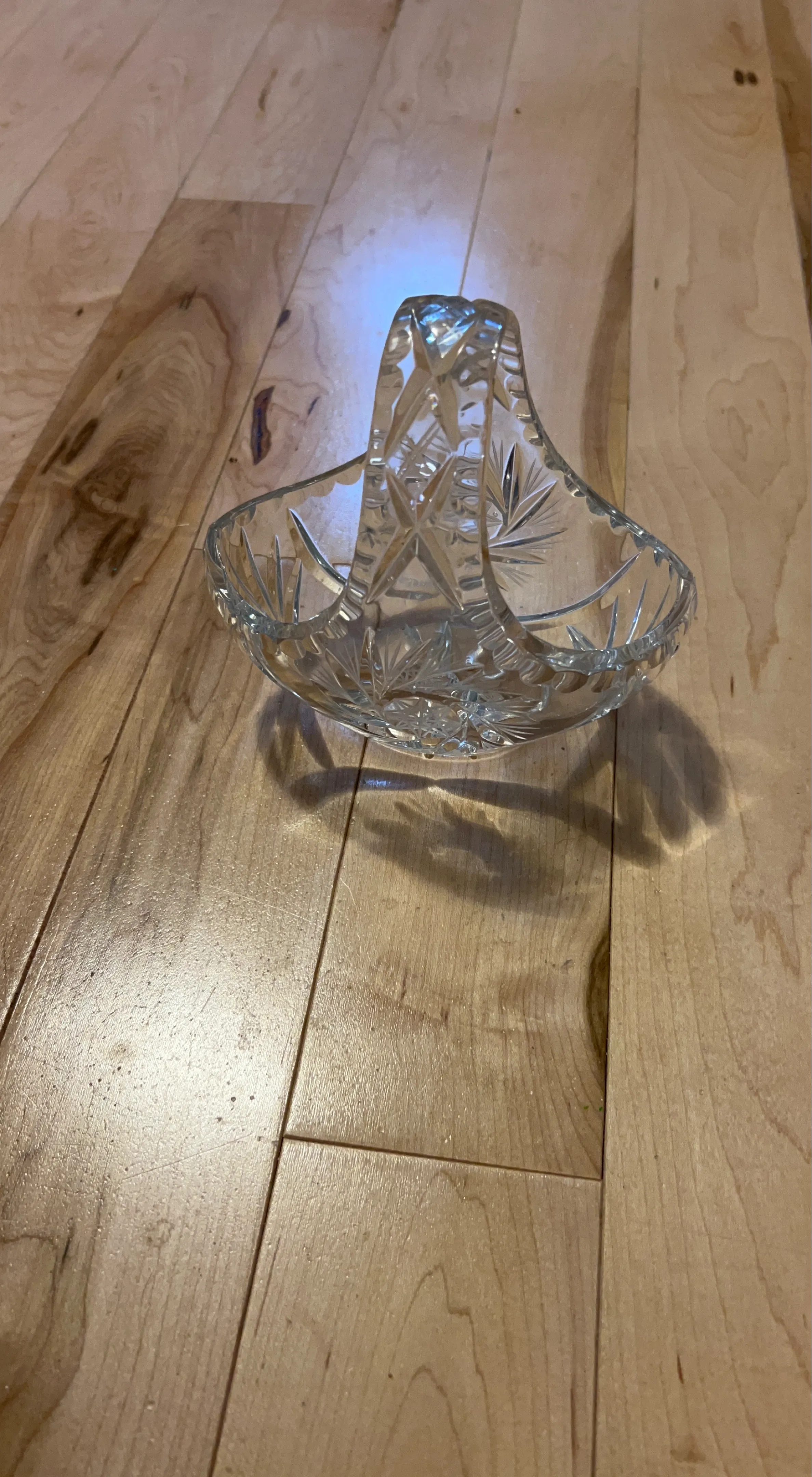 This is a beautiful crystal cut glass basket. It features intricate star and fan patterns around the bowl and handle. It's perfect for holding small candies or trinkets.