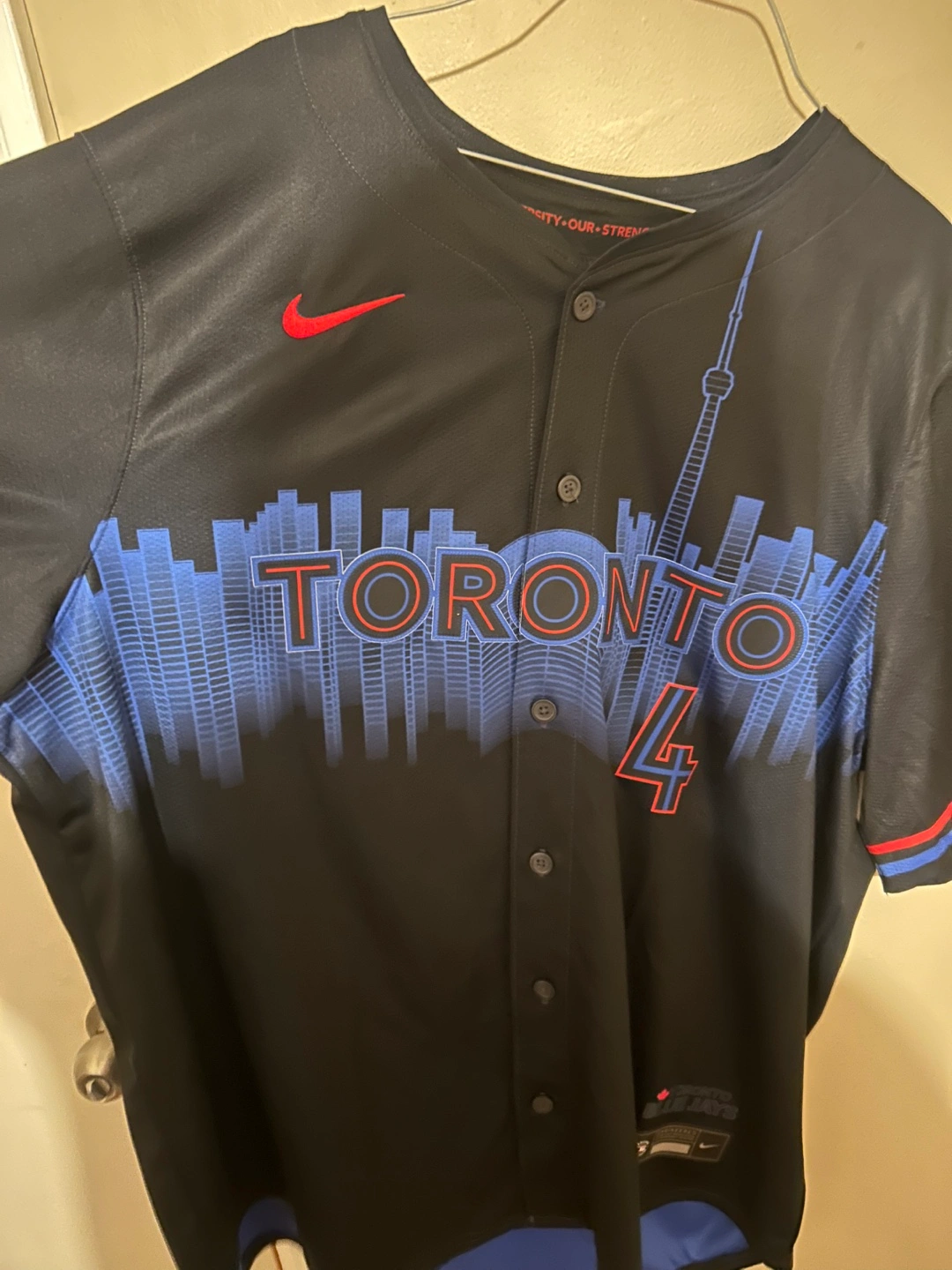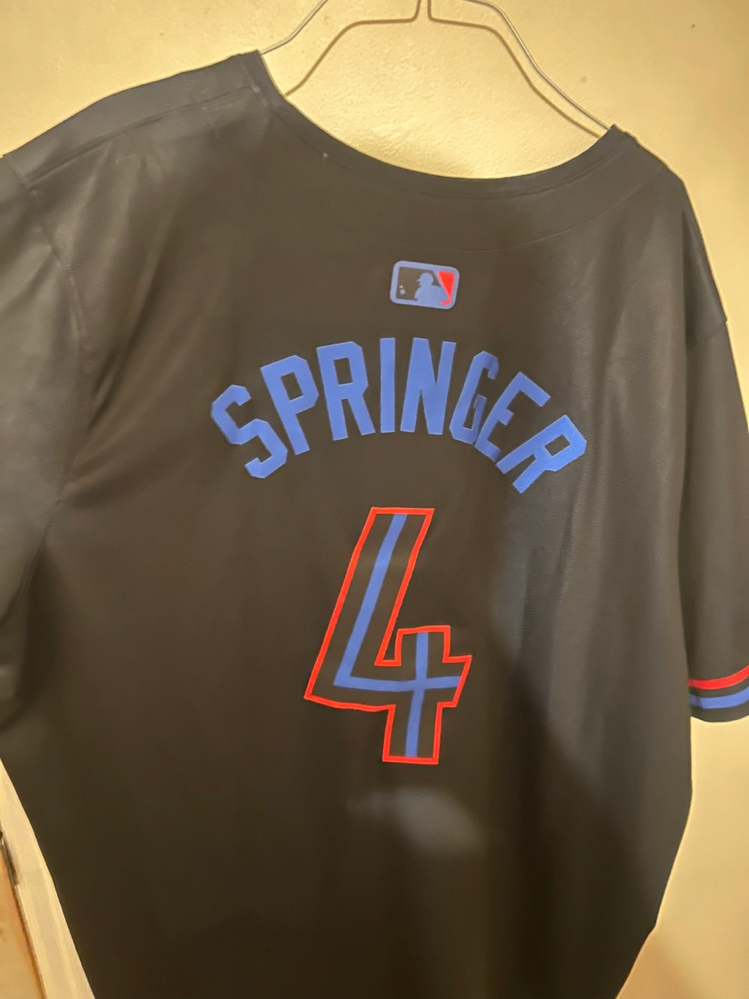 Selling a Nike George Springer Navy Toronto Blue Jays jersey. It features the Toronto skyline and Springer's name and number. Originally bought for $229.99 Asking 40 obo worn once to a game it was bought at
