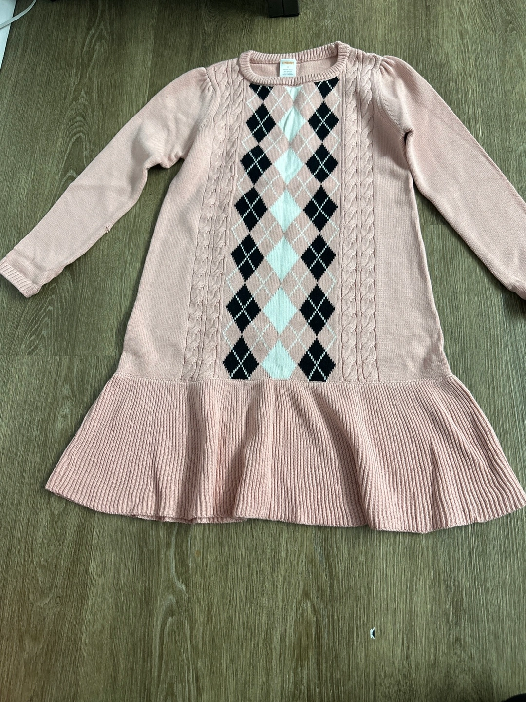 Long-sleeved pink sweater dress with black and white diamond pattern. Cable knit detail on the front and a ruffled bottom.