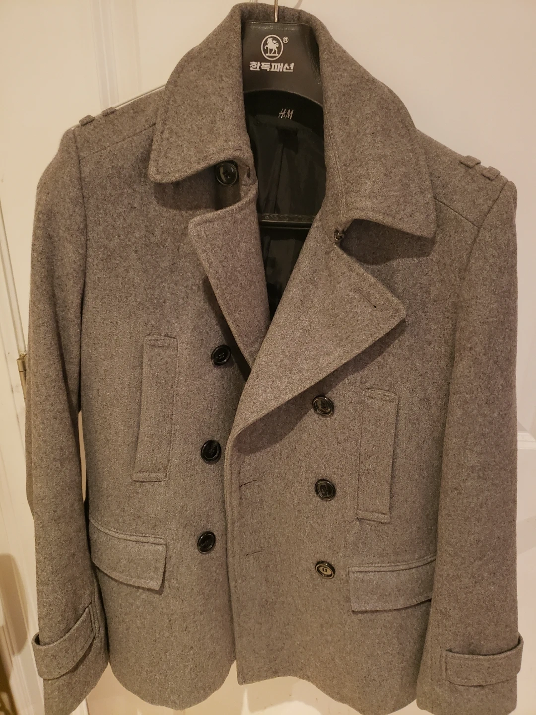 Stylish grey double-breasted coat from H&M. It's made from a wool blend and features a classic pea coat design with button closures and epaulets. This coat is perfect for cooler weather, offering both warmth and a sharp look...only cash 💸