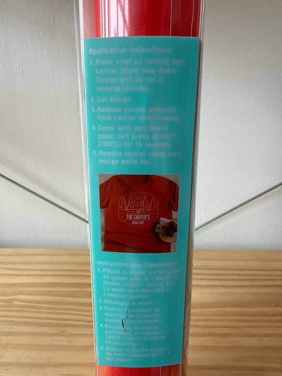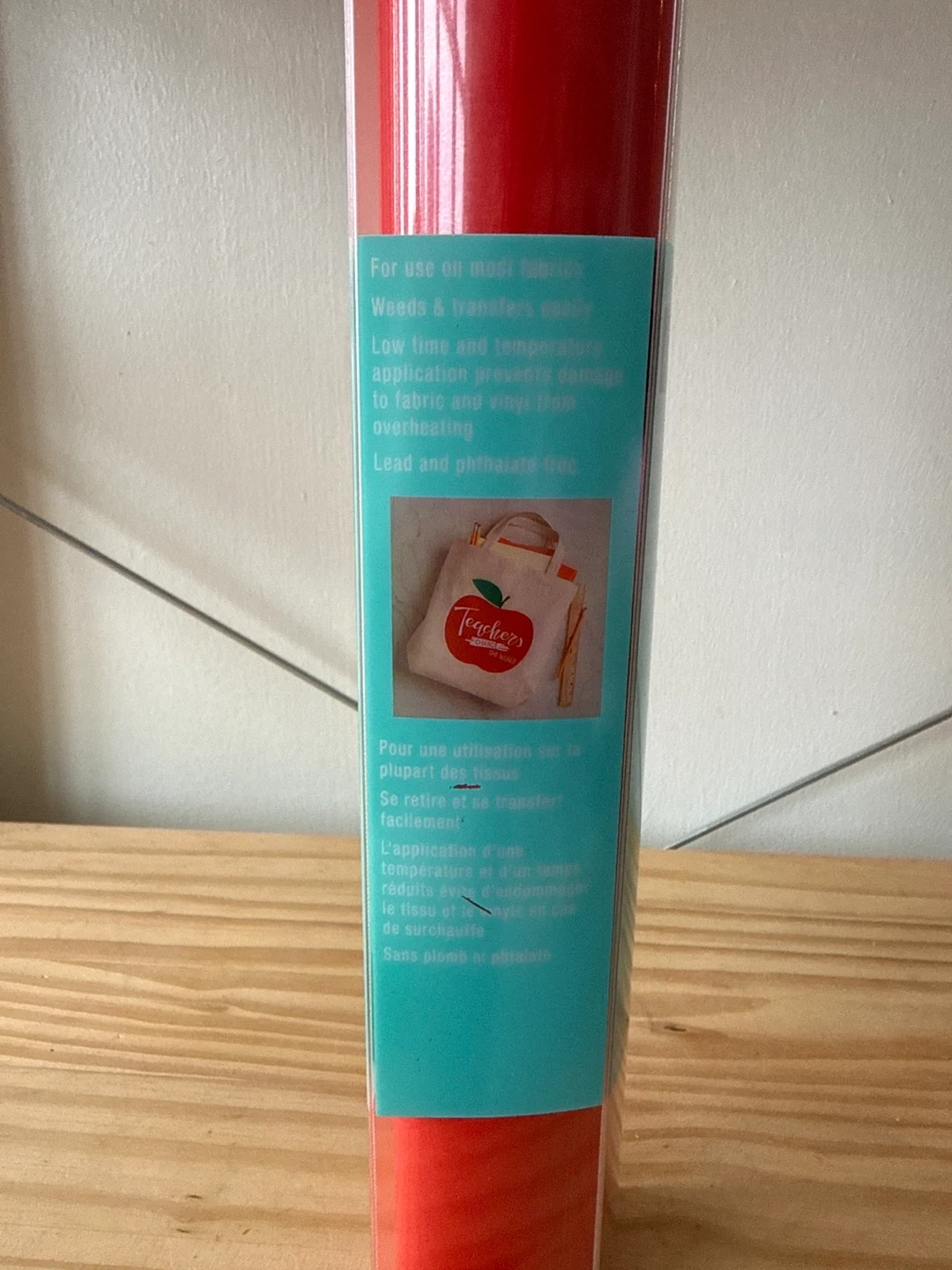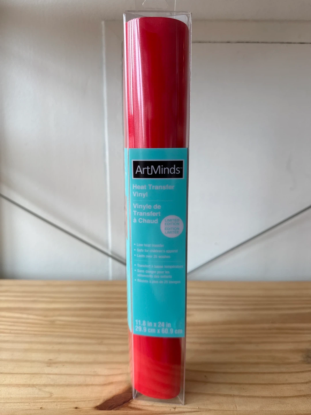 This is a roll of ArtMinds Heat Transfer Vinyl in red. It's 11.0 in x 24 in (28.0 cm x 60.9 cm). This vinyl weeds and transfers easily, and applies at a low heat setting to prevent damage to fabrics. Lead and phthalate-free.