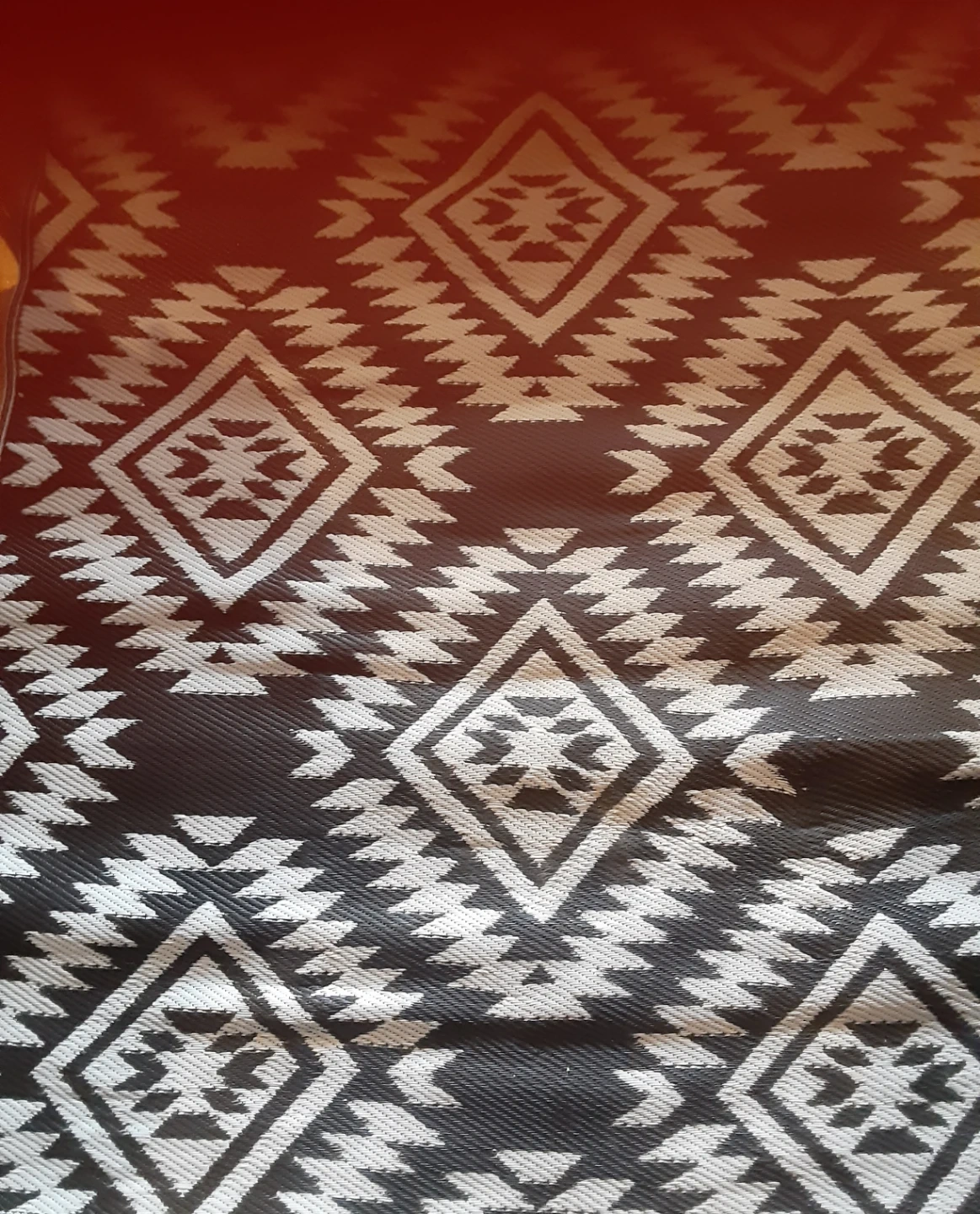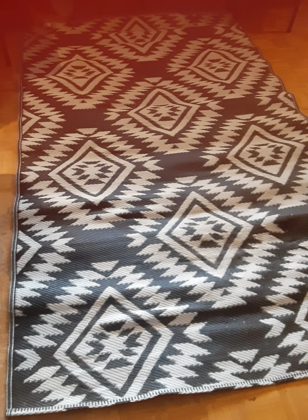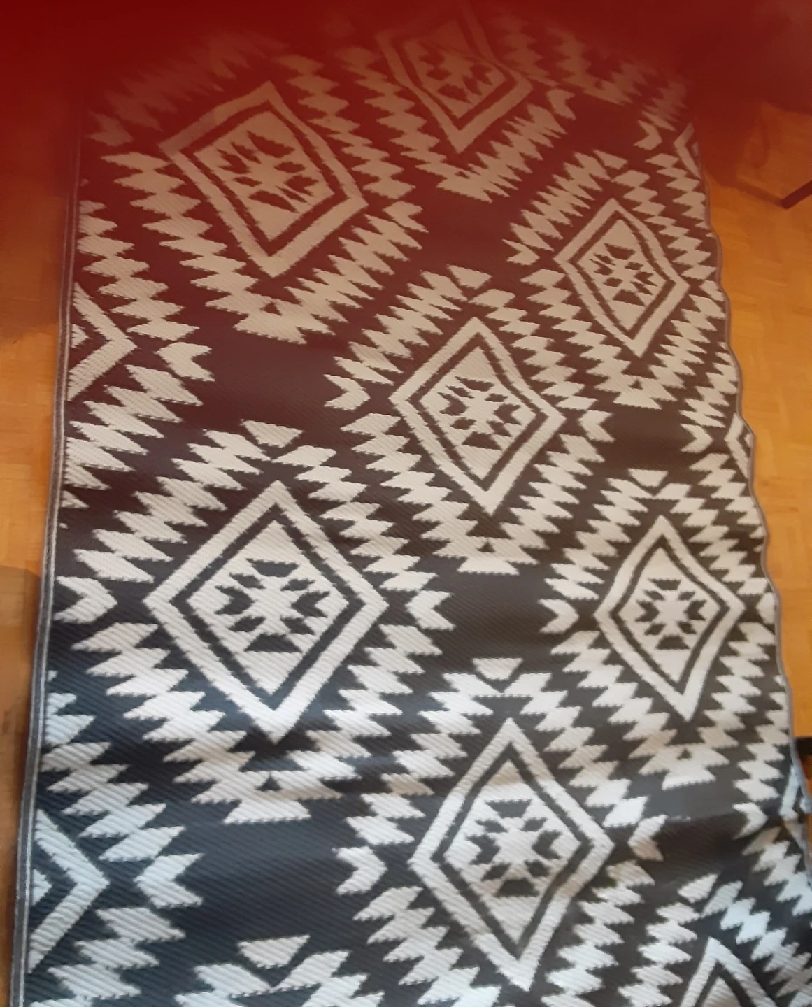 A dark grey and white patterned area rug. It has a geometric diamond design. This rug is great for adding a decorative touch to any room. It is reversible and can be an added touch to your patio.
