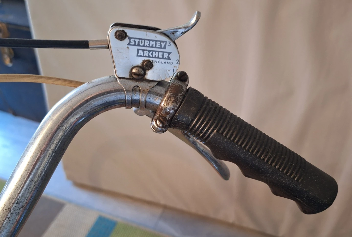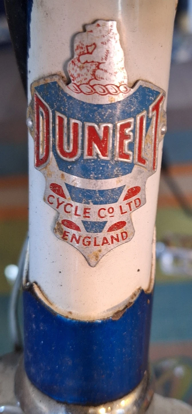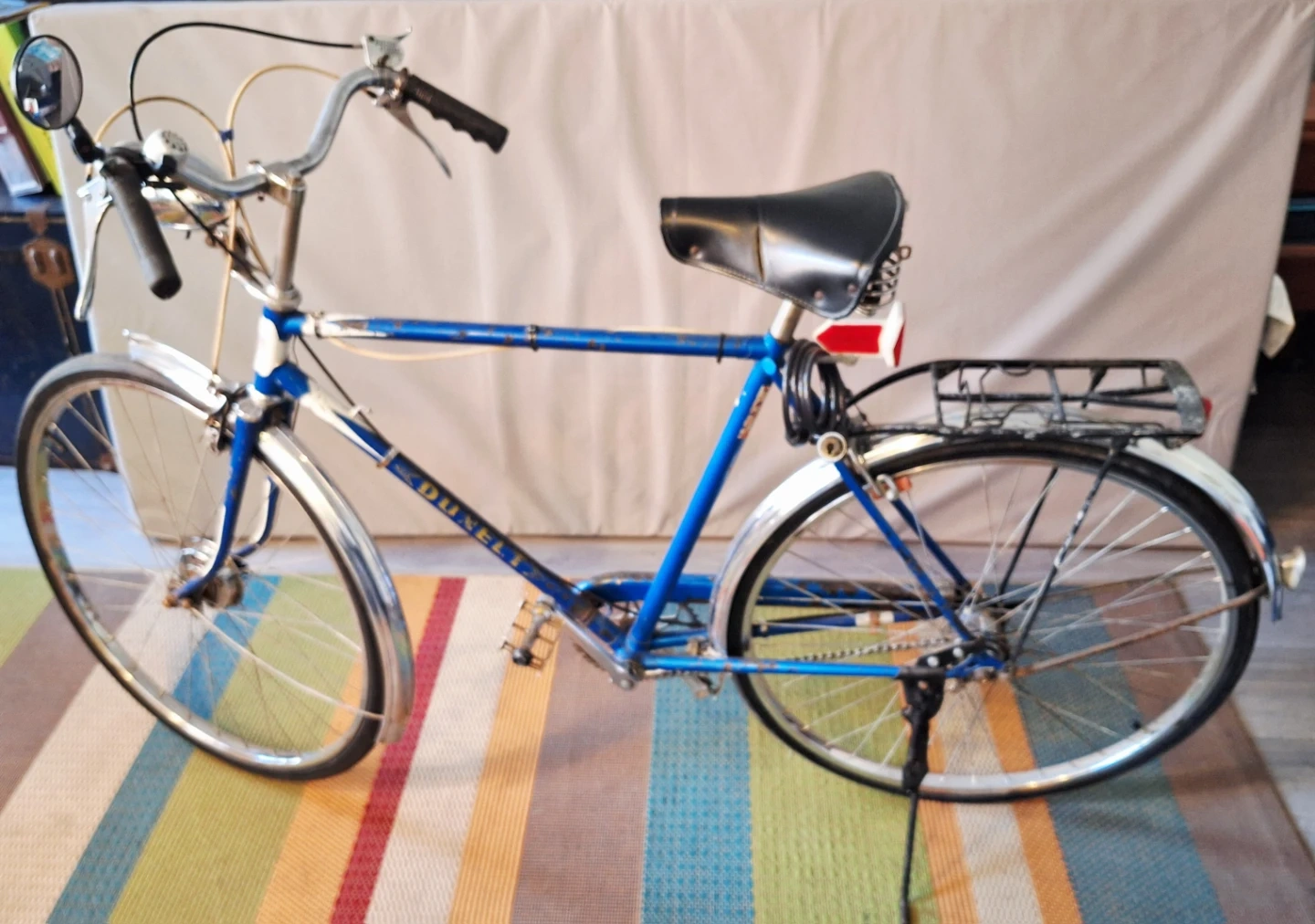 Vintage 60s English made, blue Dunelt bicycle with a 3 speed Sturmey Archer gear shifter. Features working hub magneto light, French Lyotard pedals, rear rack and a kickstand. This bike is great for commuting or casual rides.