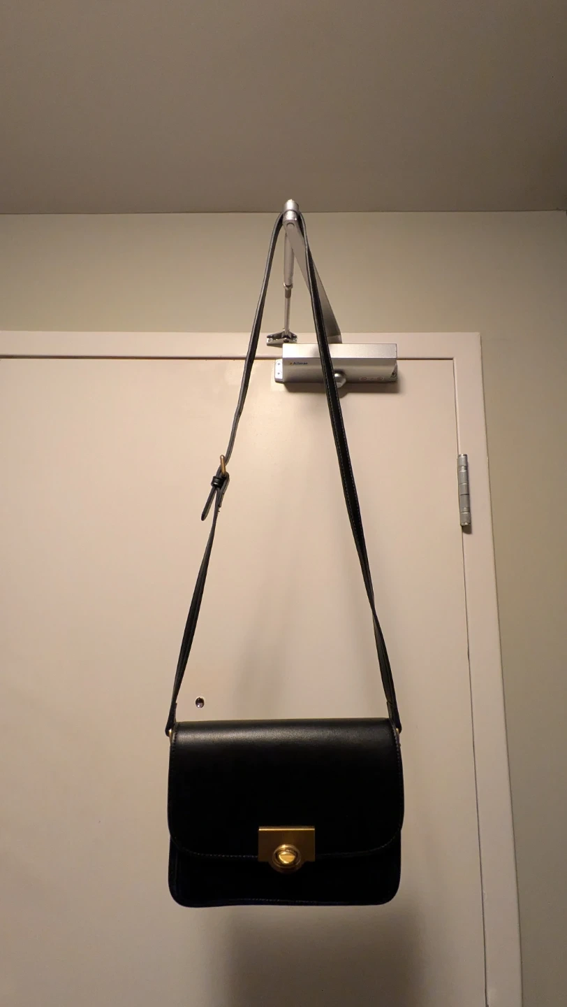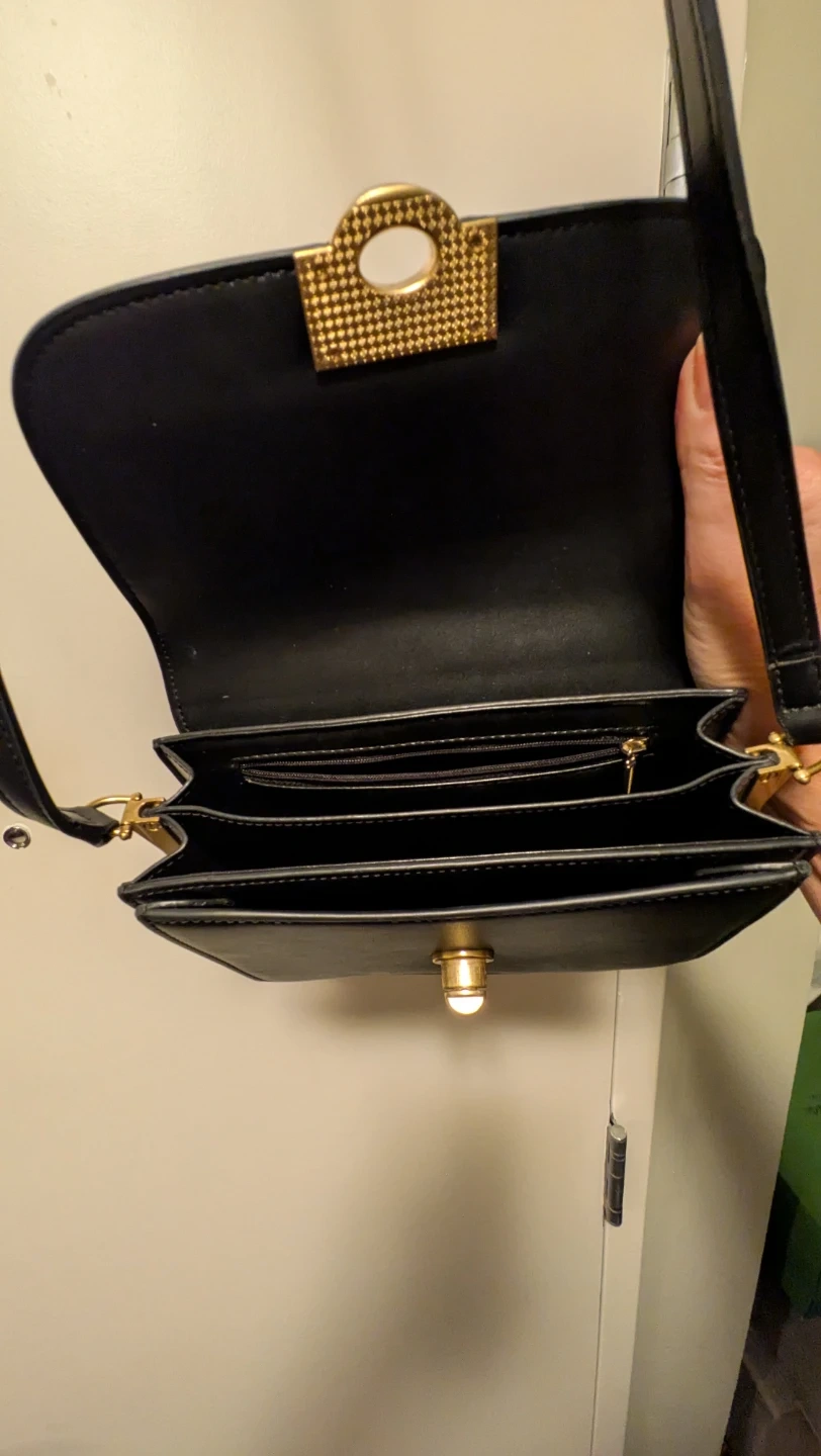 This black shoulder bag is made of faux leather. It has a main compartment with a zip pocket inside. The bag closes with a secure clasp on the front.