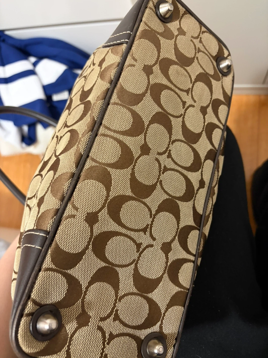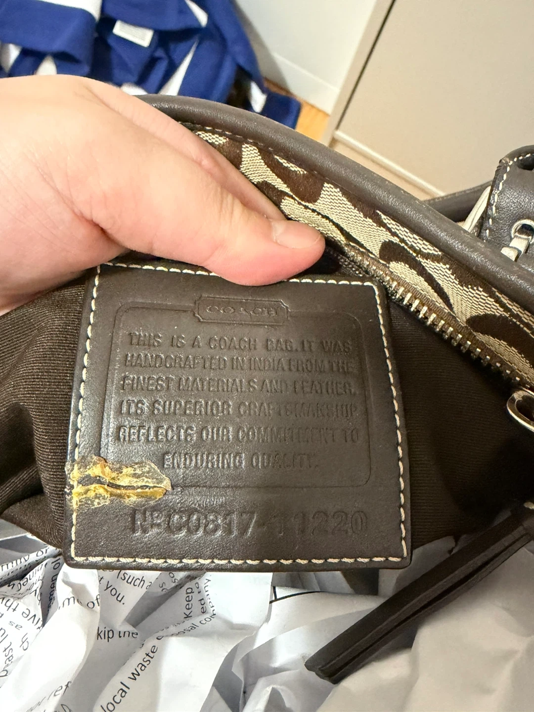Classic Coach monogram canvas handbag with dark brown leather trim and handles. It features the signature Coach "C" pattern and silver-tone hardware. This bag was handcrafted in India from fine materials, reflecting superior craftsmanship. It's a stylish accessory for everyday use.