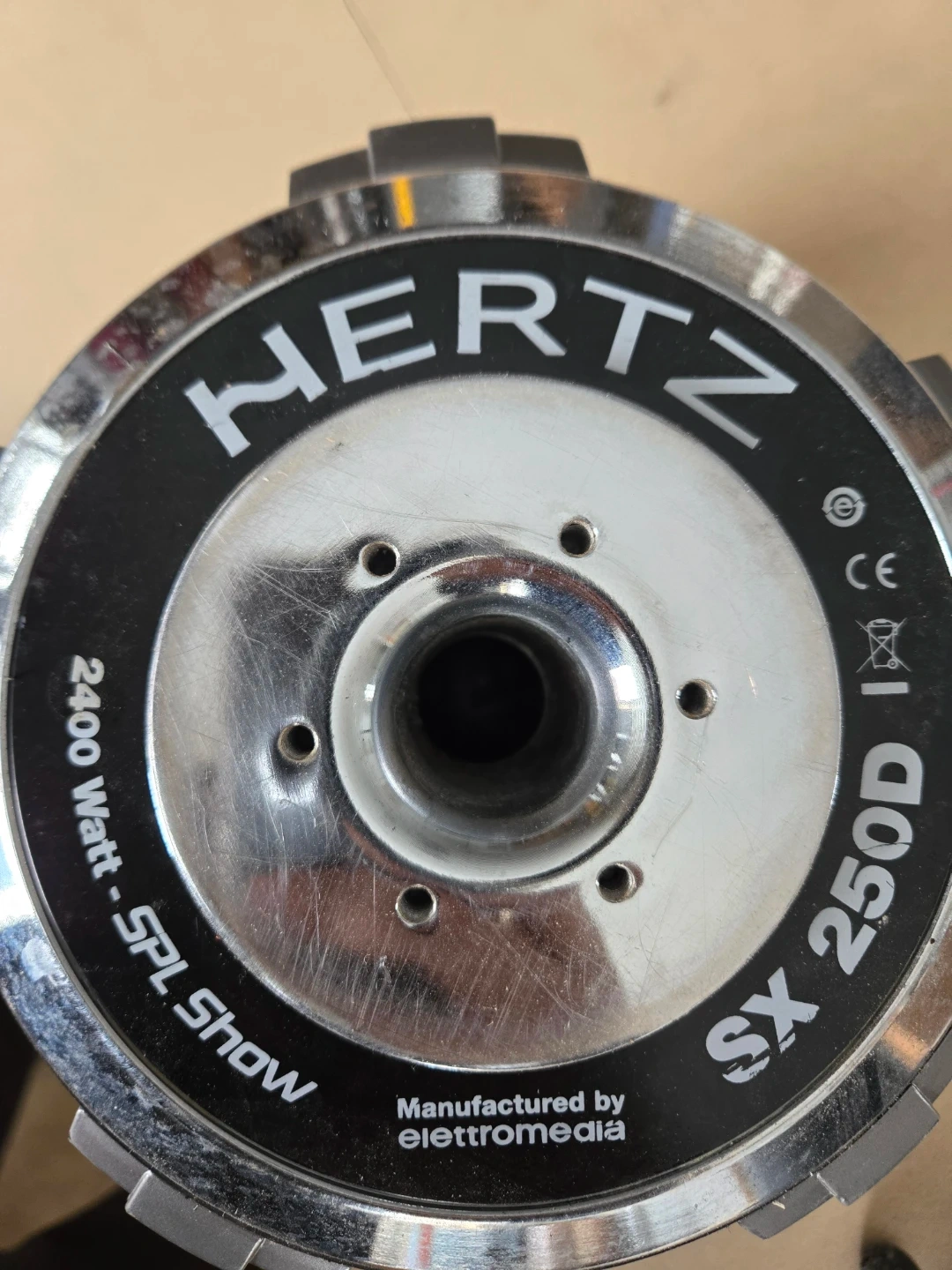 Hertz SPL Show SX 250D subwoofer. Power handling 2400 Watts. Manufactured by Elettromedia. This subwoofer is great for loud car audio systems!