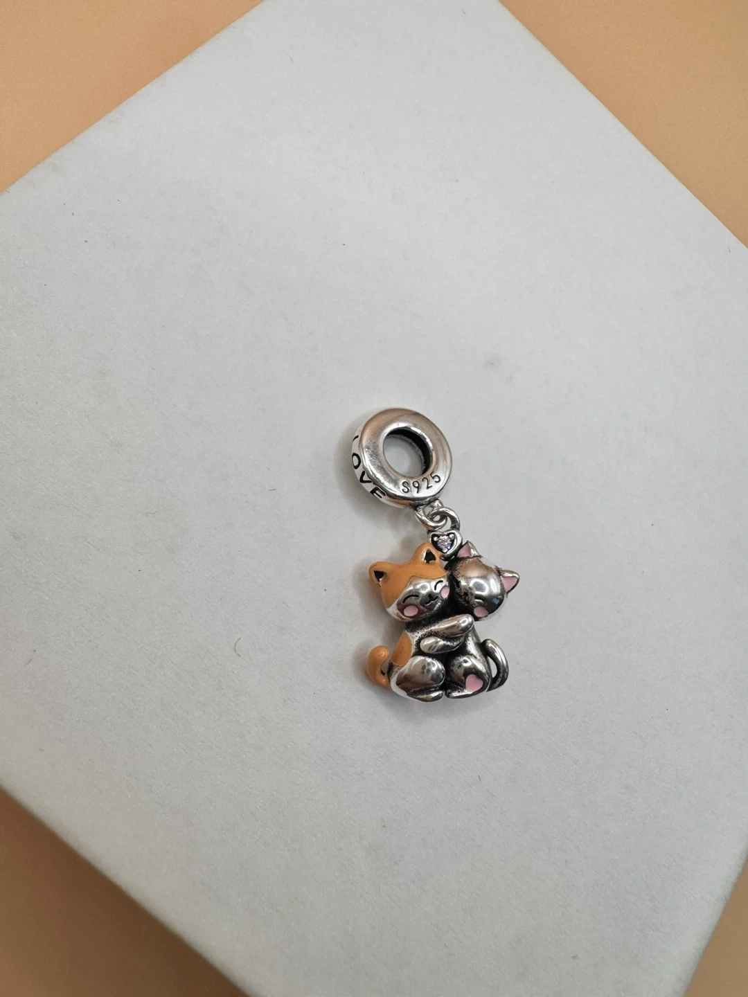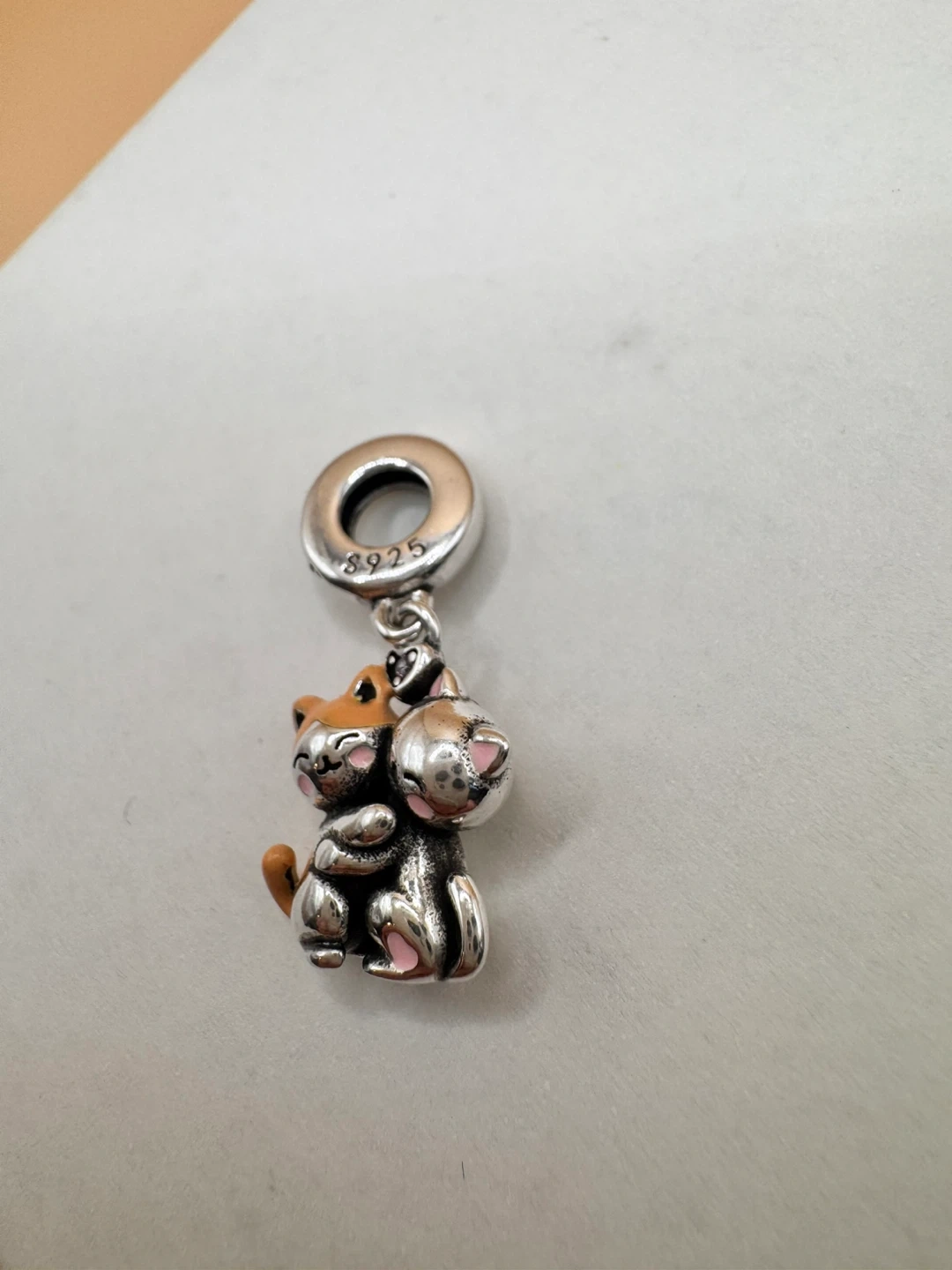 🐱This is a sterling silver charm featuring two adorable kittens embracing. It's marked S925, 92.5% pure silver. The charm has a loop for attaching to bracelets or necklaces. It's a sweet piece for any cat lover!