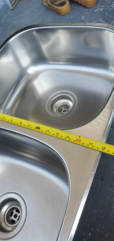 Selling a double stainless steel kitchen sink. It measures approximately 31 inches in length, 17 inches in width, and 8 inches in depth. Perfect for any kitchen upgrade!