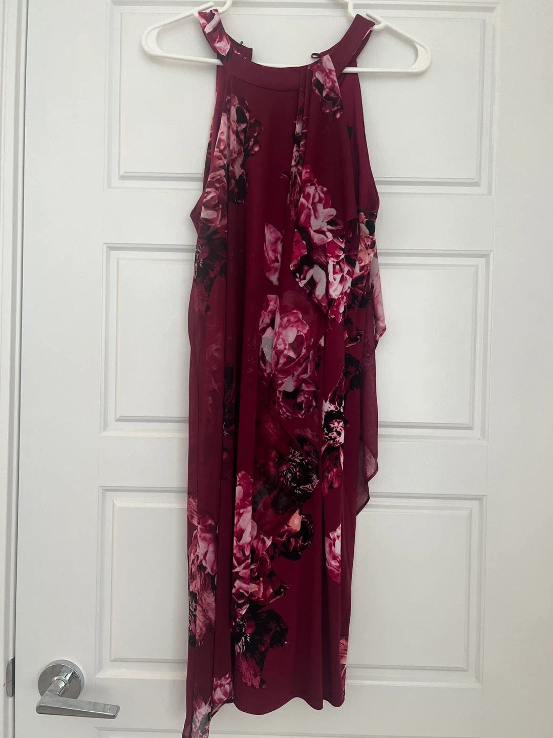 Selling a lovely burgundy dress with a floral pattern. It's a halter style and perfect for a special occasion or a night out. The dress is in great condition and ready for a new home!