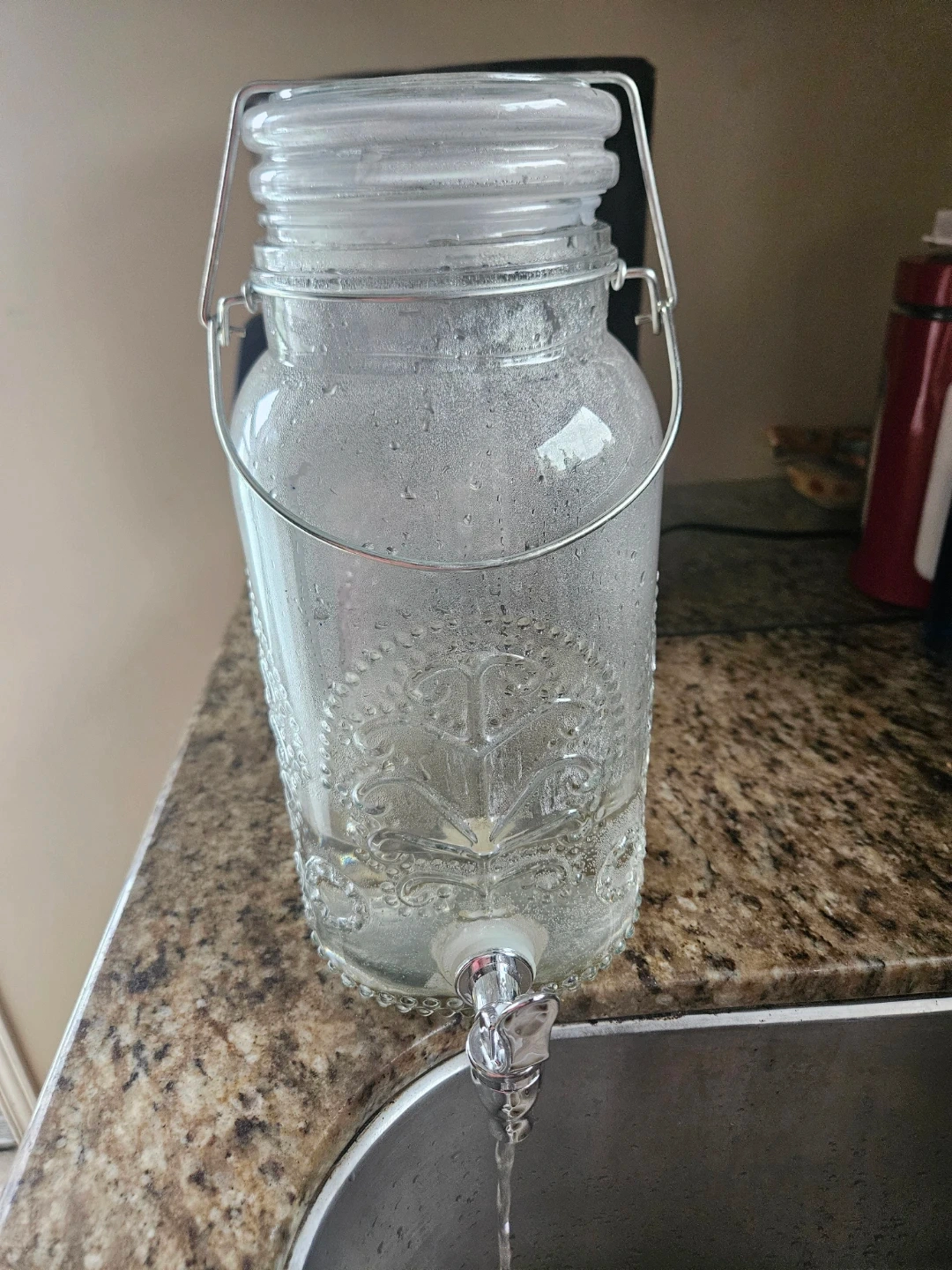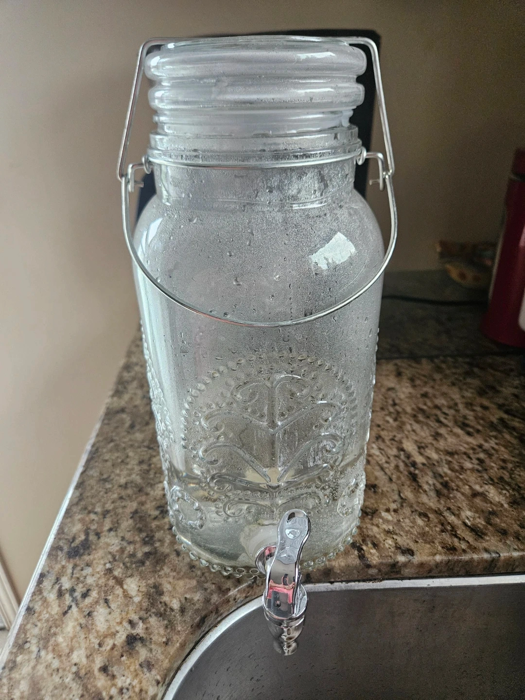 Clear glass beverage dispenser with a metal spigot. Features a decorative embossed pattern and a wire bail lid closure. It's suitable for parties or everyday use.