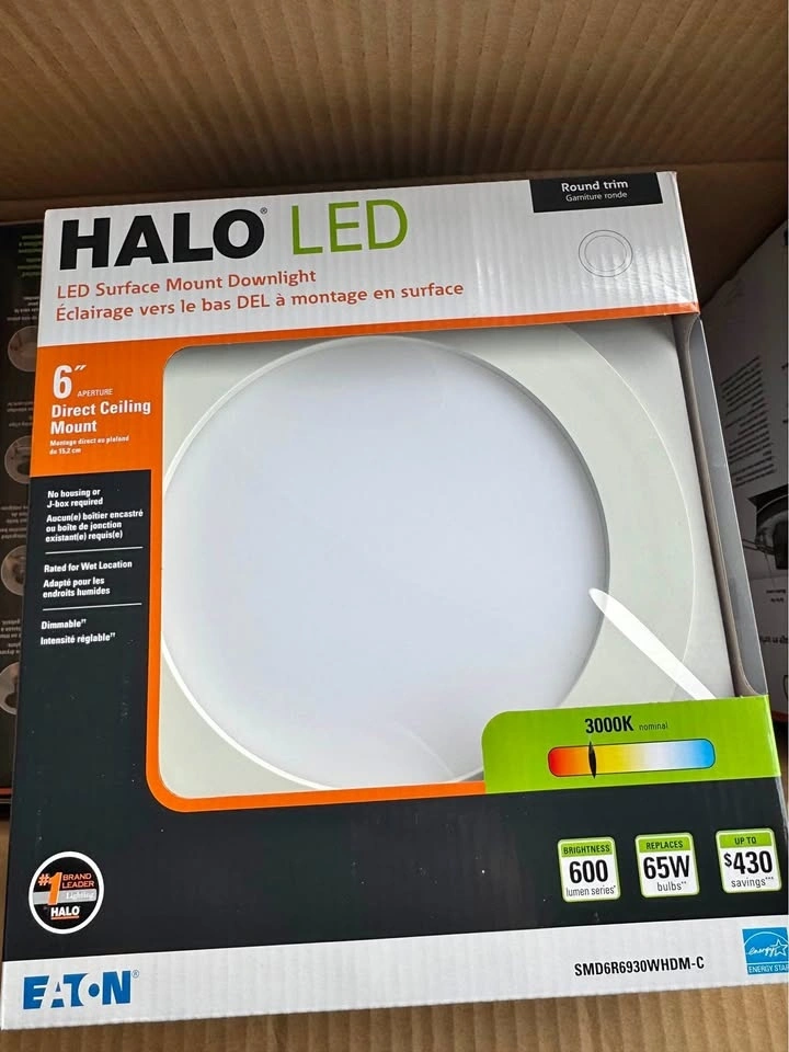 New 6 inch LED surface mount downlight. Bought extra, have several. Dimmable light with 3000K color. Has 600 lumens, replaces 65W bulbs. Wet location rated, so good for bathrooms or outdoors. No housing or J-box needed, direct ceiling mount. Can meet in the city if need be. $10 each or box of six for $50. Have 40 available. Buy 2 boxes of 6 for $45 per box. Buy 3 boxes of six for $40 per box.