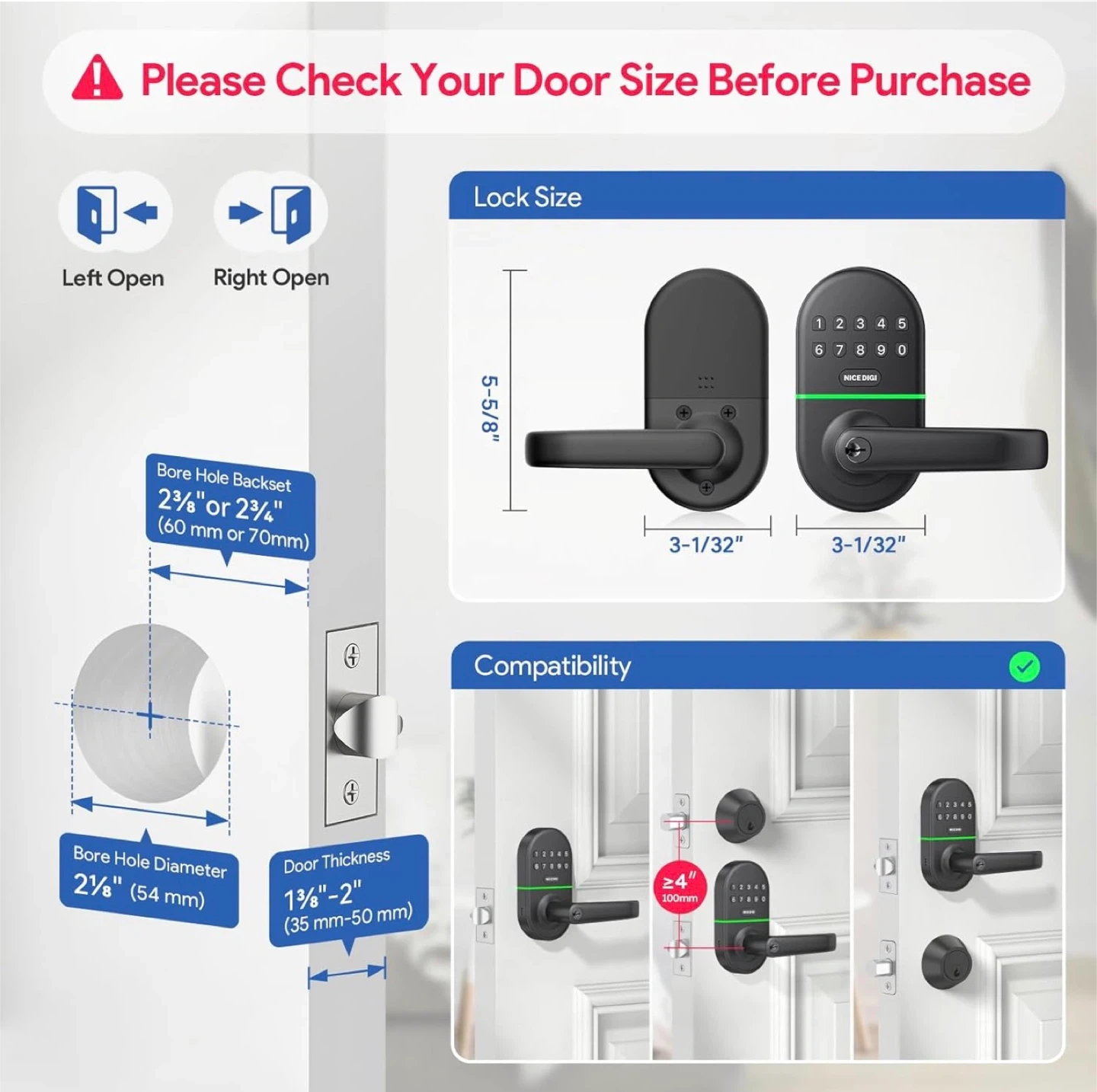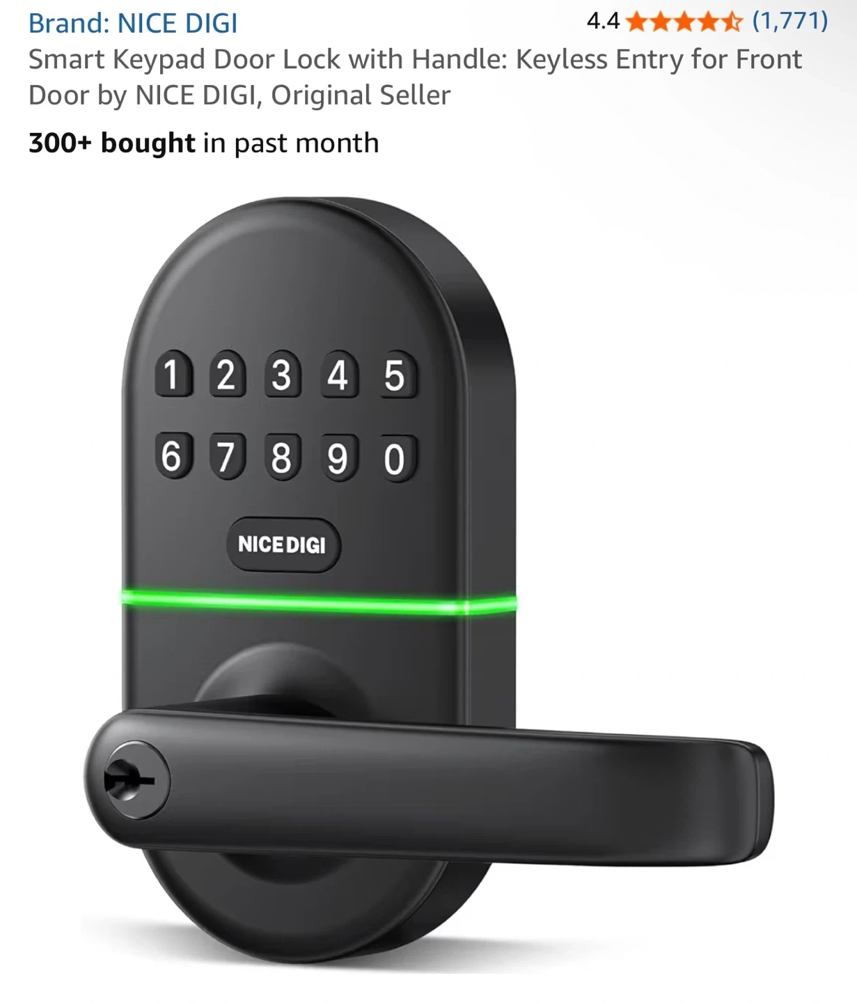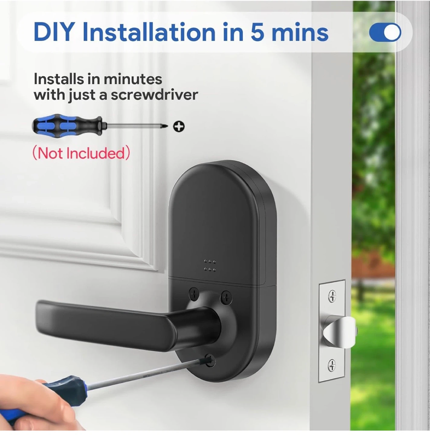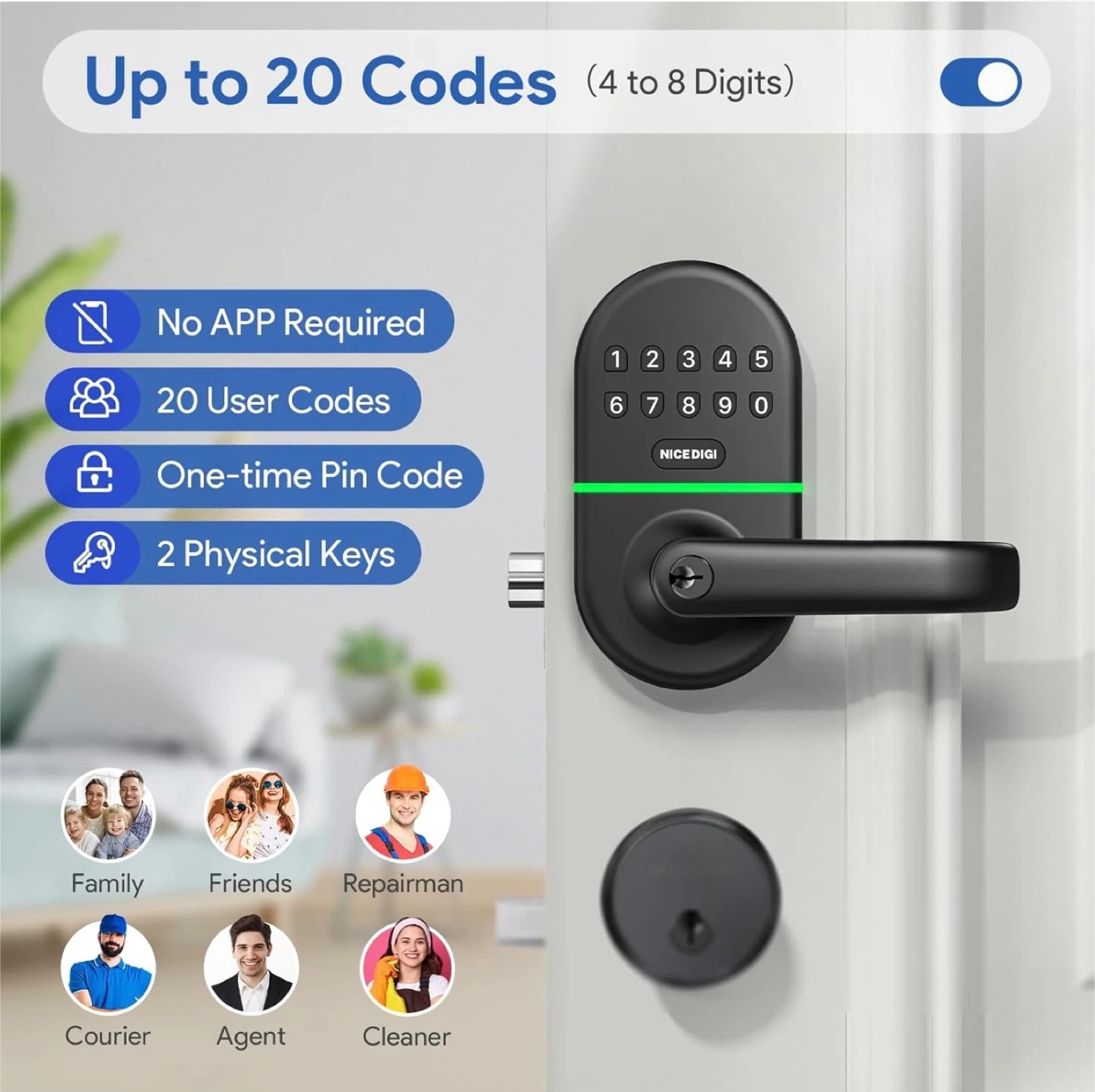 This NICE DIGI smart keypad door lock offers keyless entry for your front door. It supports up to 20 user codes and a one-time pin code, with no app required. Two physical keys are included as a backup. Installation is easy, taking about 5 minutes with just a screwdriver.