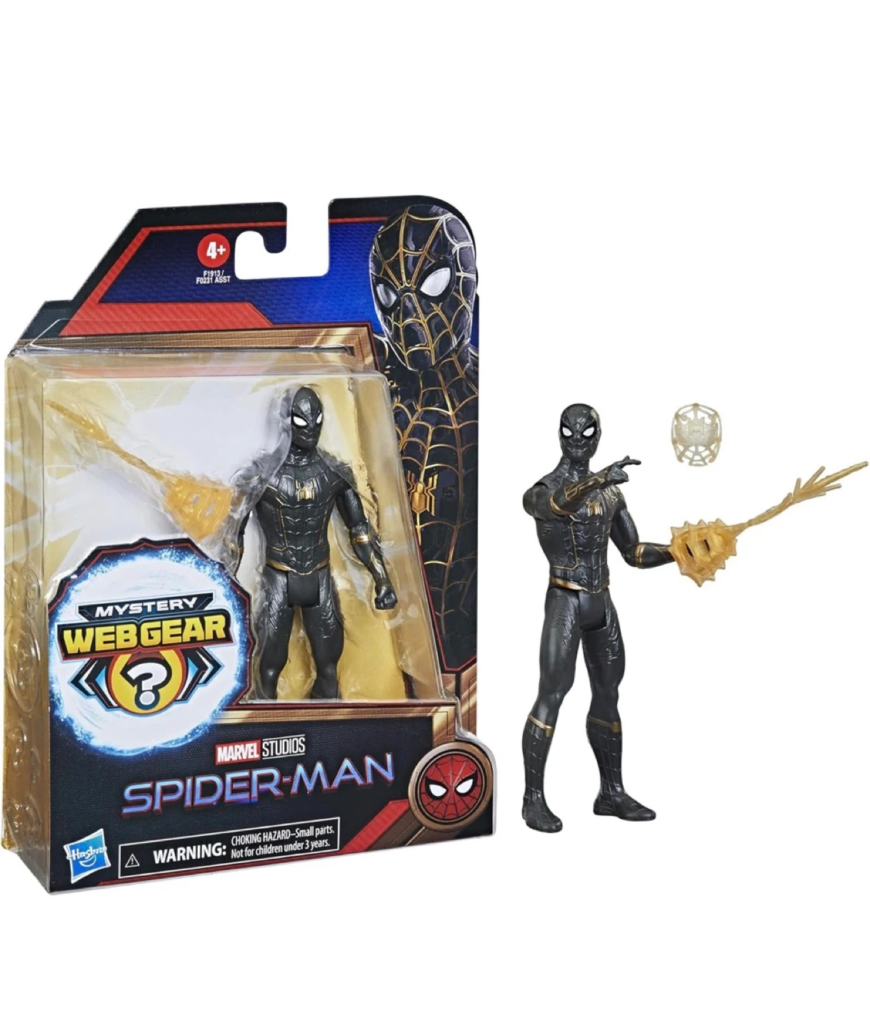 This is a Marvel Spider-Man 6-inch action figure in his black and gold suit. It includes mystery web gear accessories. Suitable for ages 4 and up.