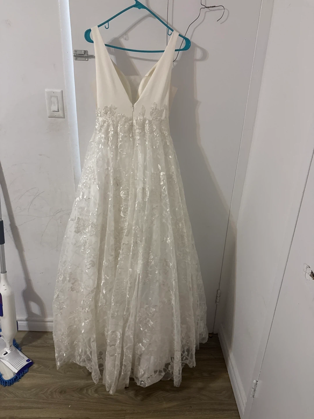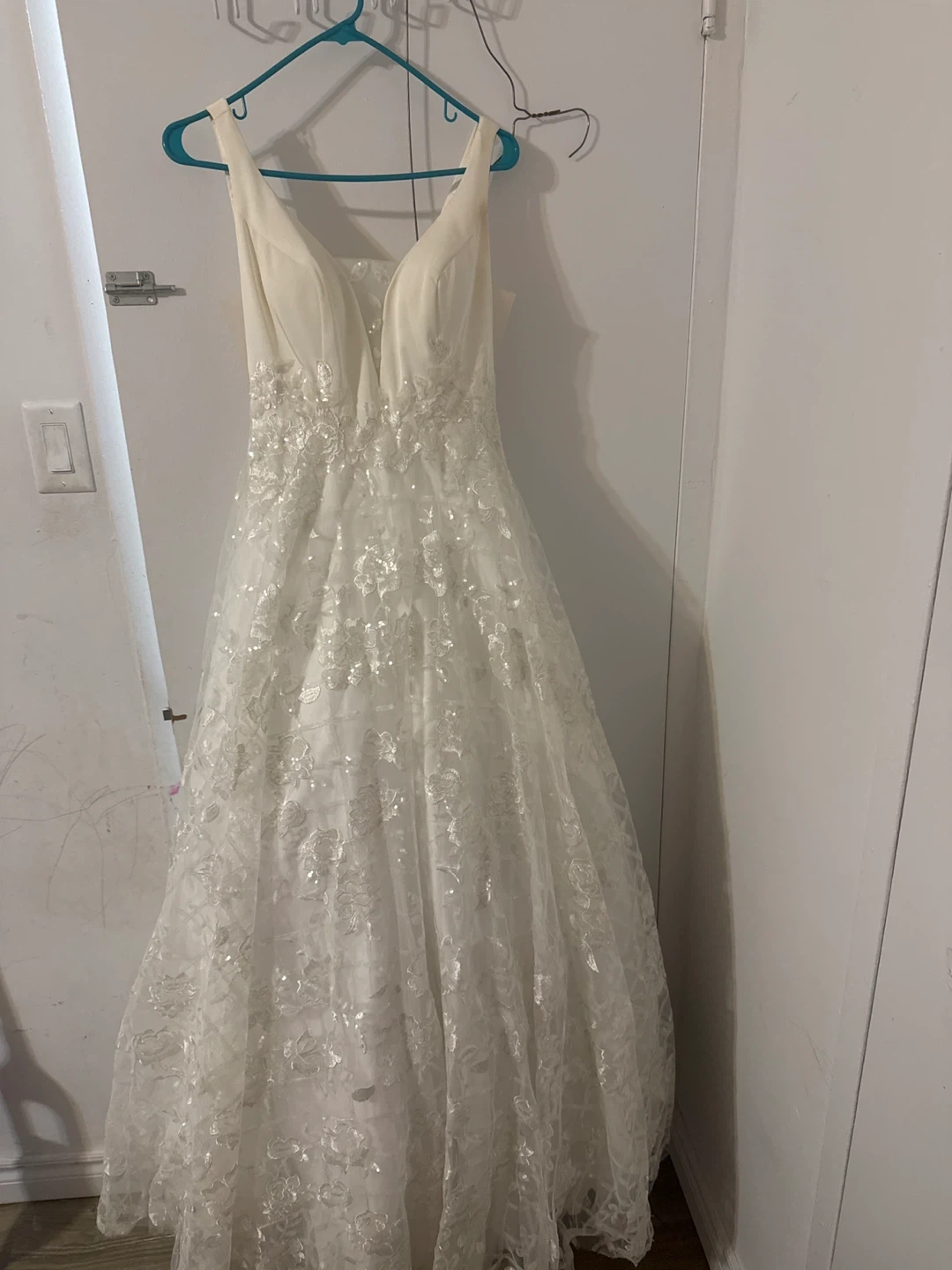 Beautiful white wedding dress with intricate lace detailing. It's a size S and made of 100% polyester. This dress would be lovely for a wedding day!