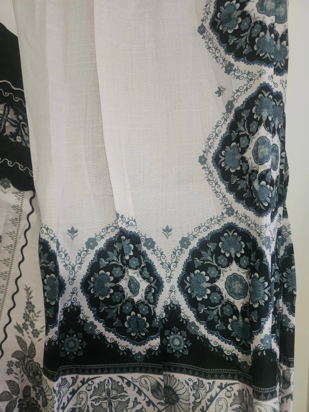 This is a lovely kurta and pants set with a detailed ethnic print. The fabric appears to be a light .suitable for warm weather. It's a two-piece outfit perfect for casual or semi-formal occasions.brand ethnic.