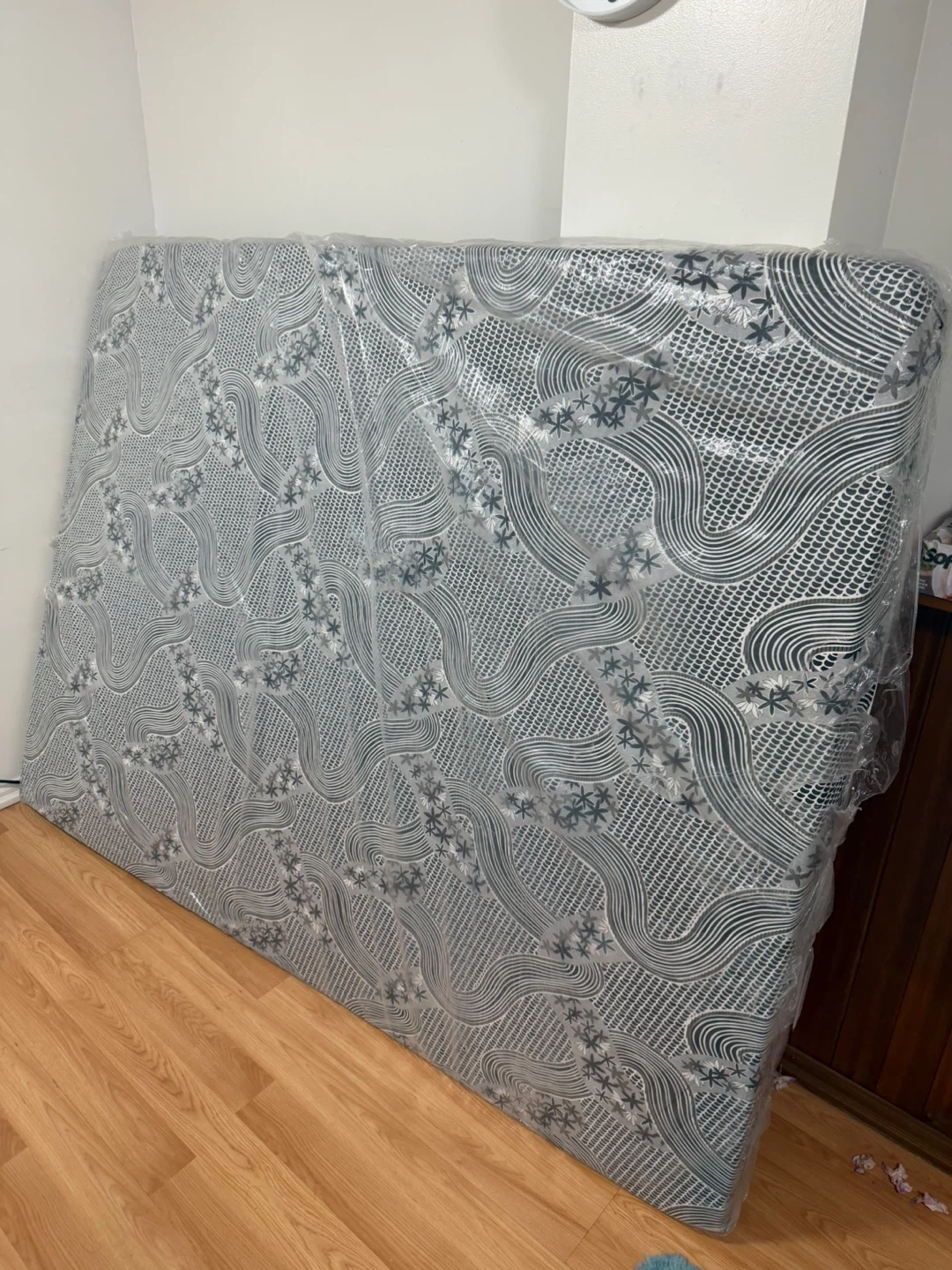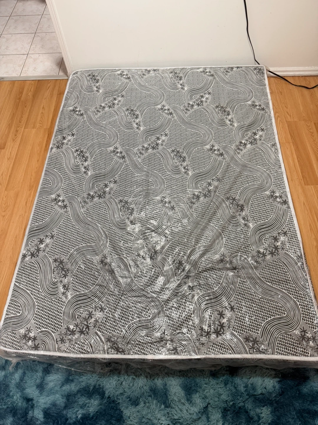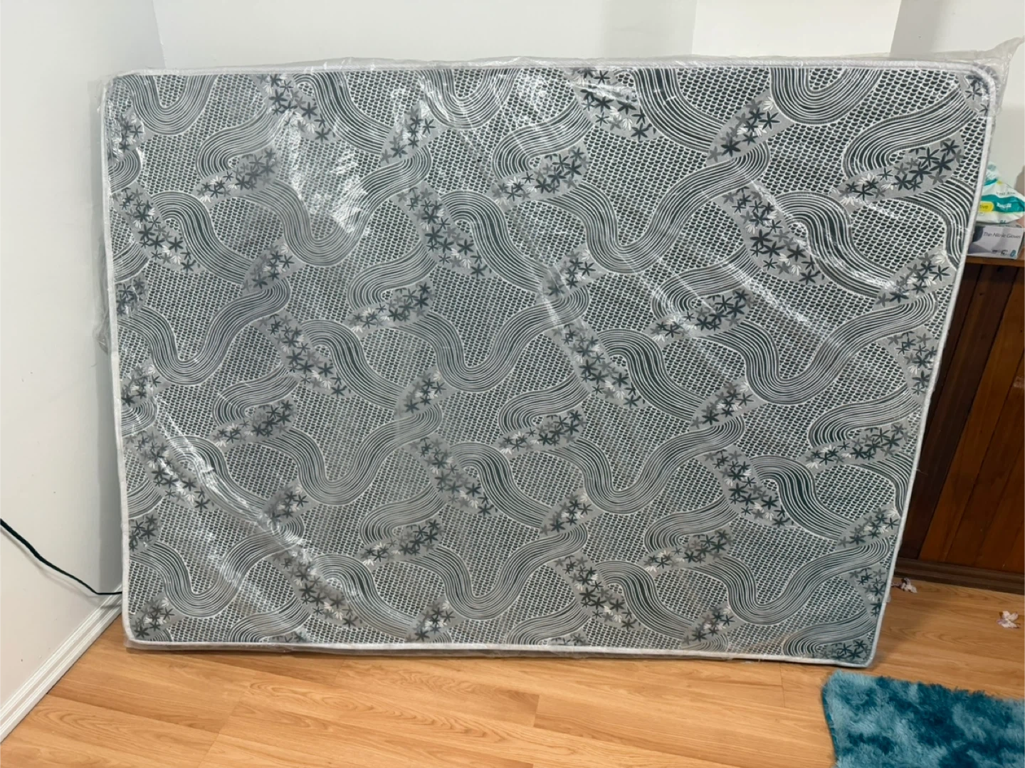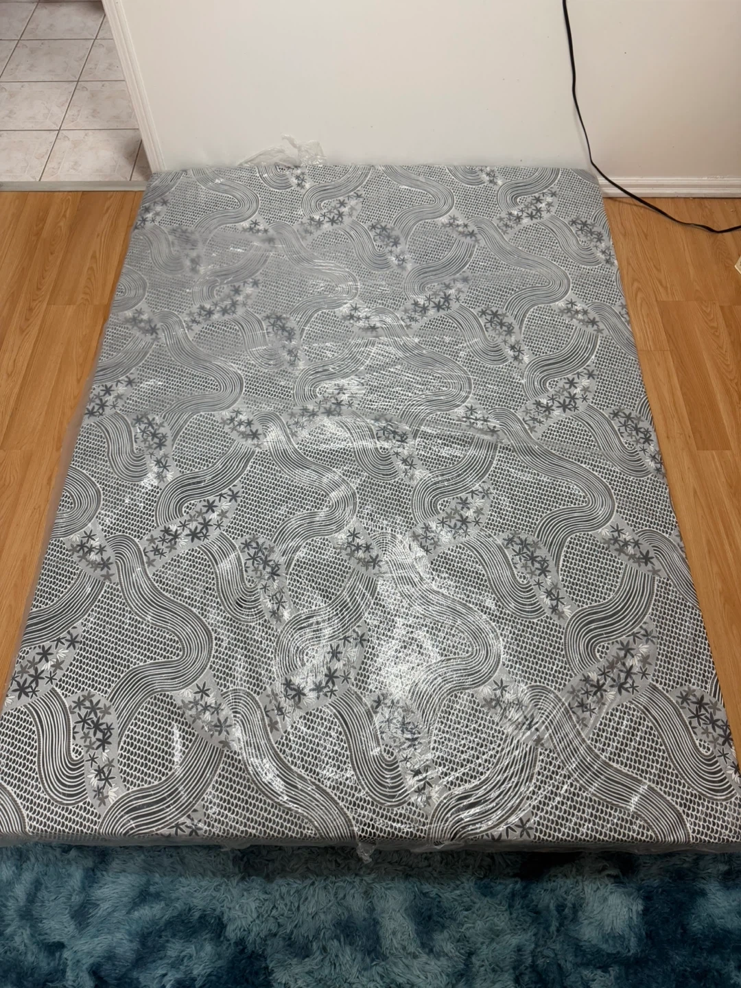 This is a mattress still in its original plastic wrapping. It has a grey pattern with wavy lines and starburst shapes. It's a queen size mattress.