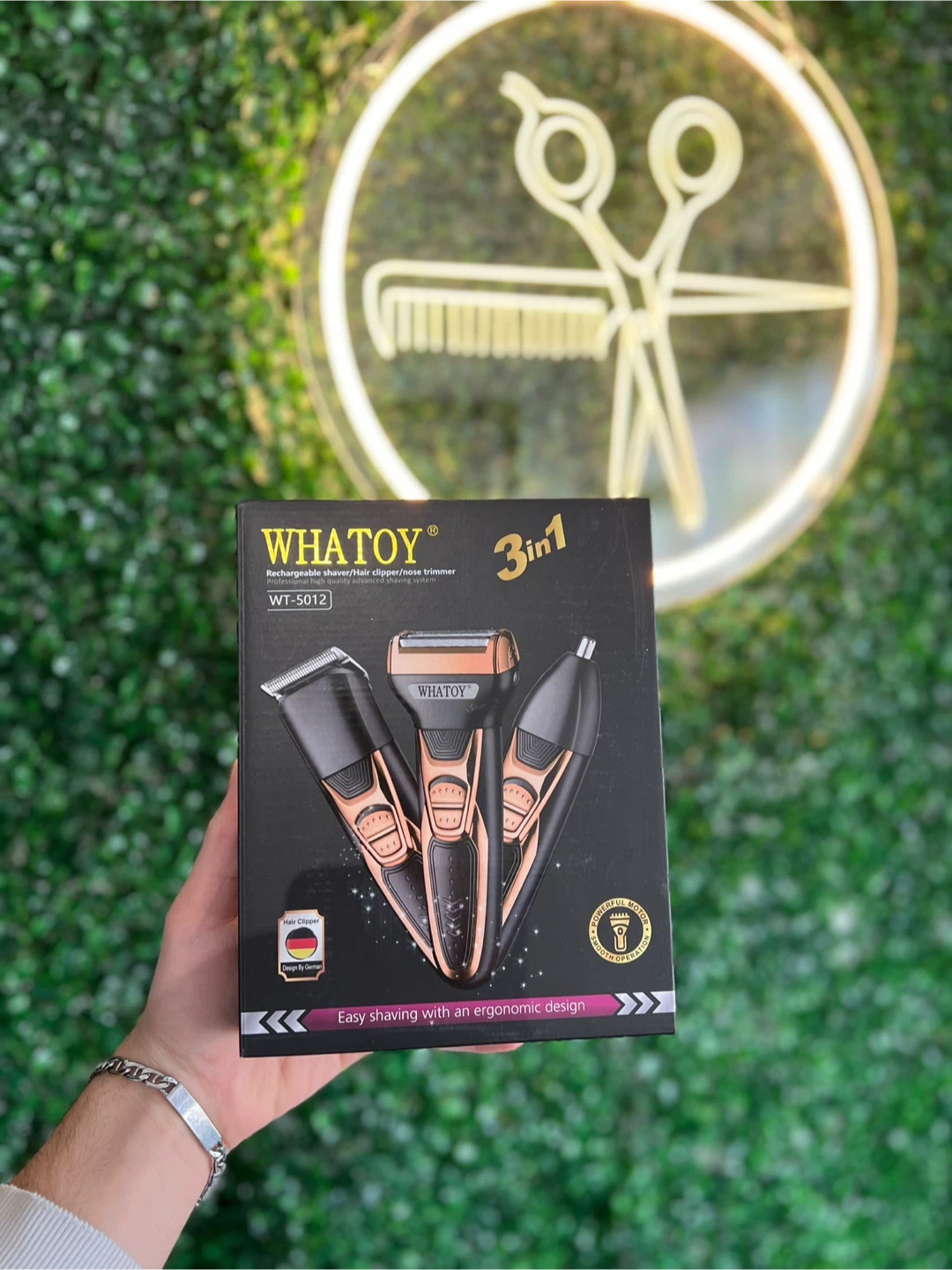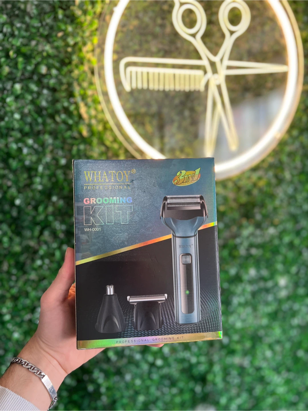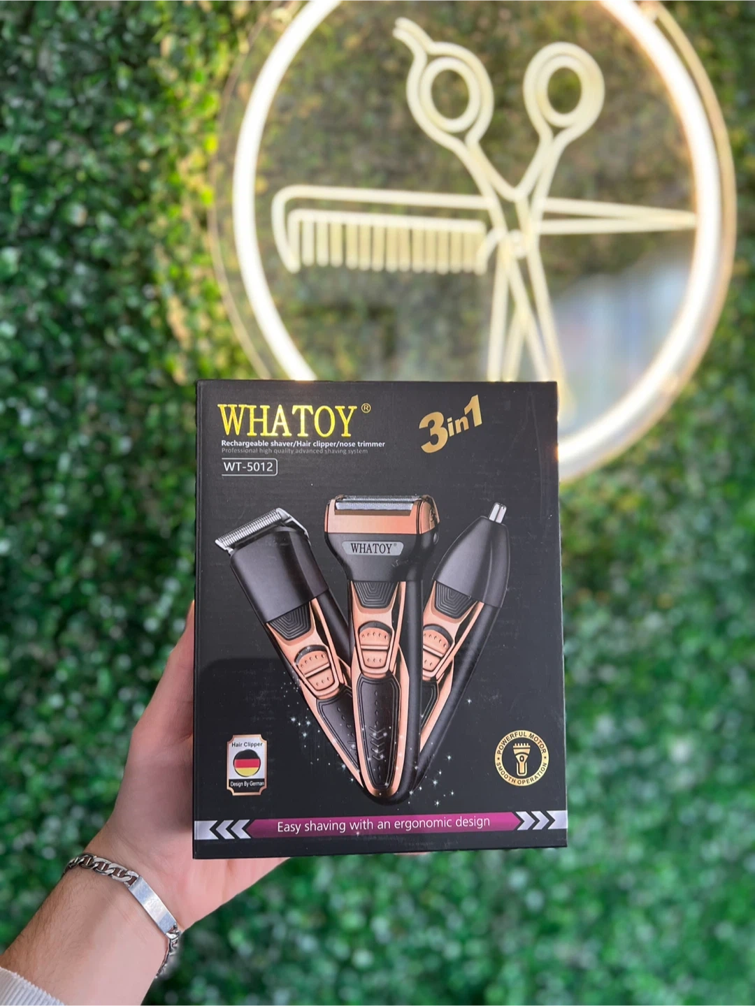 This WHAToy 3-in-1 grooming kit features a rechargeable shaver, hair clipper, and nose trimmer. It includes interchangeable heads for versatile grooming. Designed for easy shaving with an ergonomic grip.