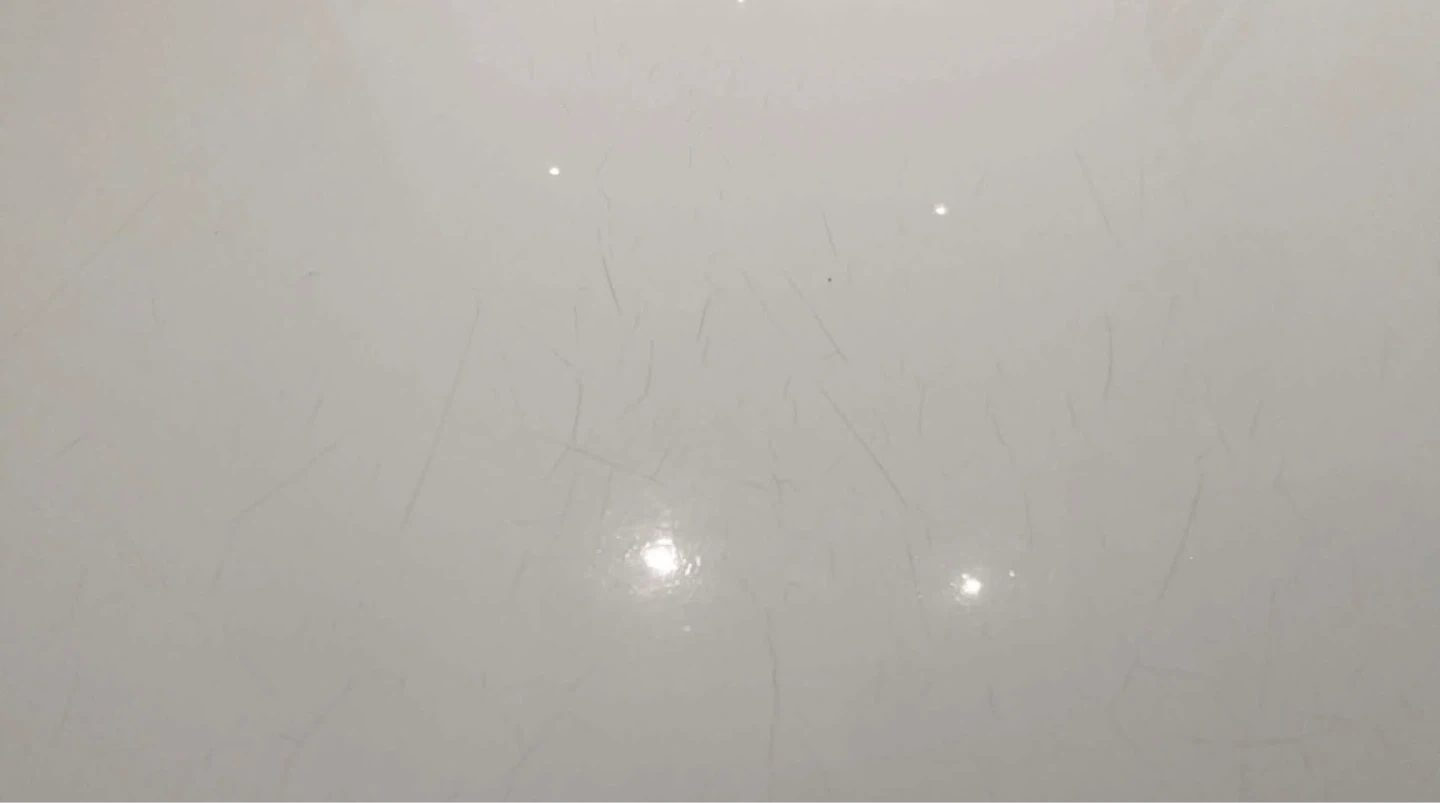 A rectangular dining table with a high gloss white top and chrome-plated legs. It measures 135 cm in length, 85 cm in width, and 75 cm in height. This table's simple design makes it a versatile addition to a dining area. The top has a number of cosmetic scratches due to general wear and tear.
