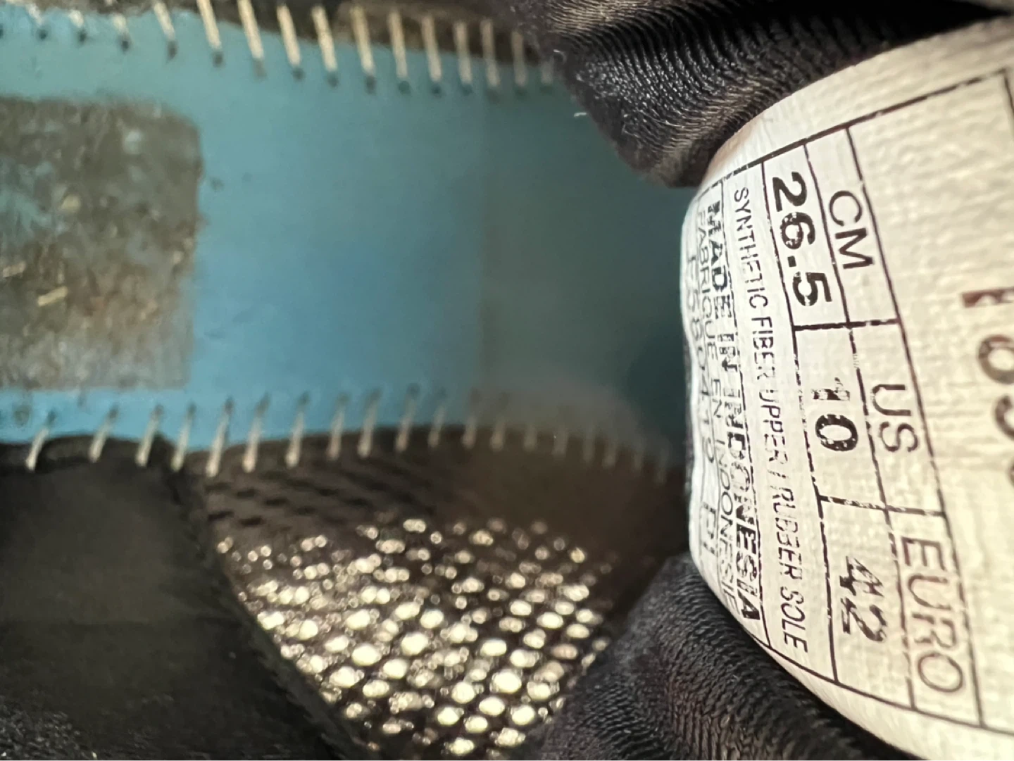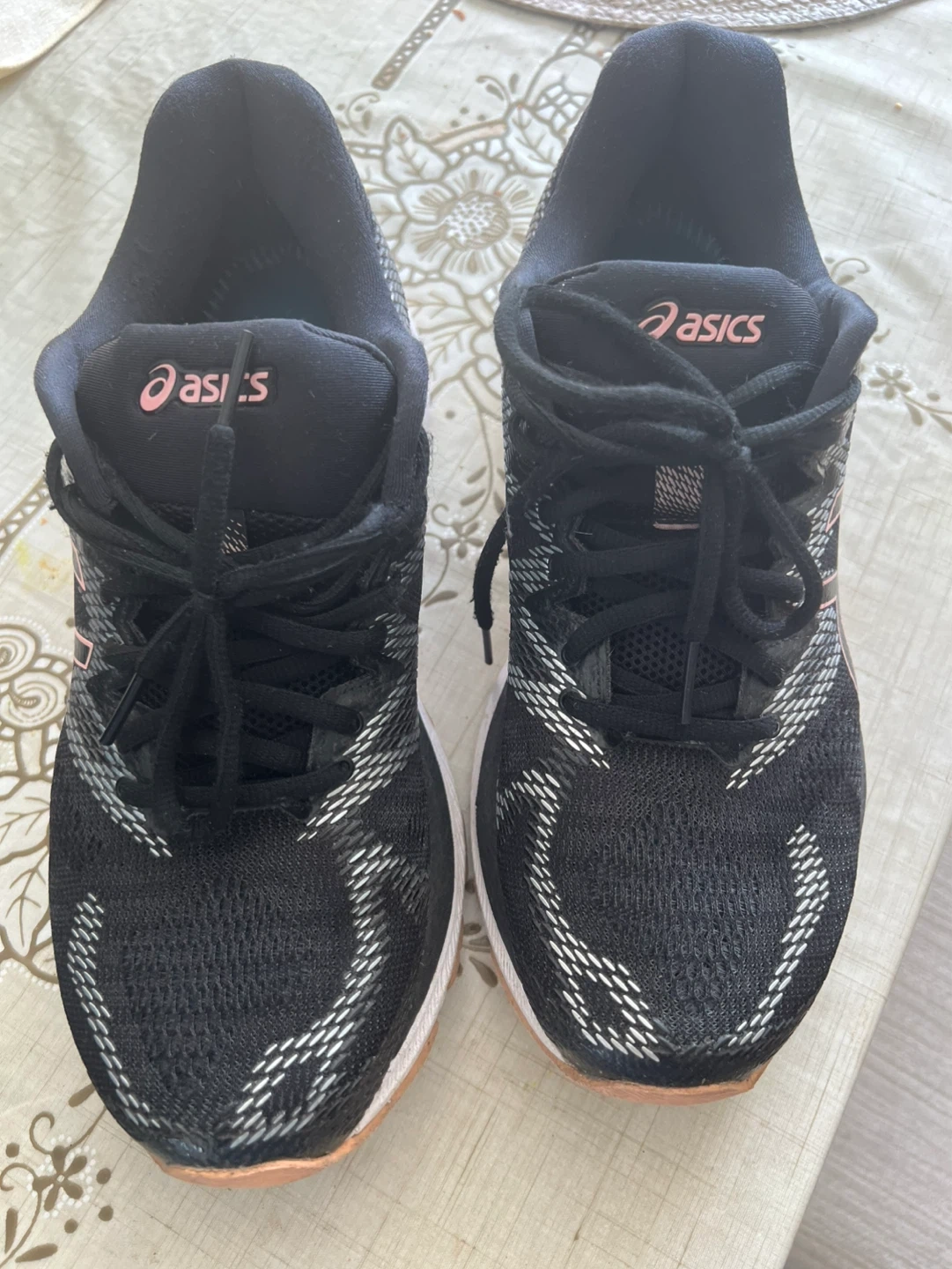 These ASICS running shoes are black with pink accents. They are a size 10 US (26.5 CM). The upper is synthetic fiber and the sole is rubber. Manufactured in Indonesia.