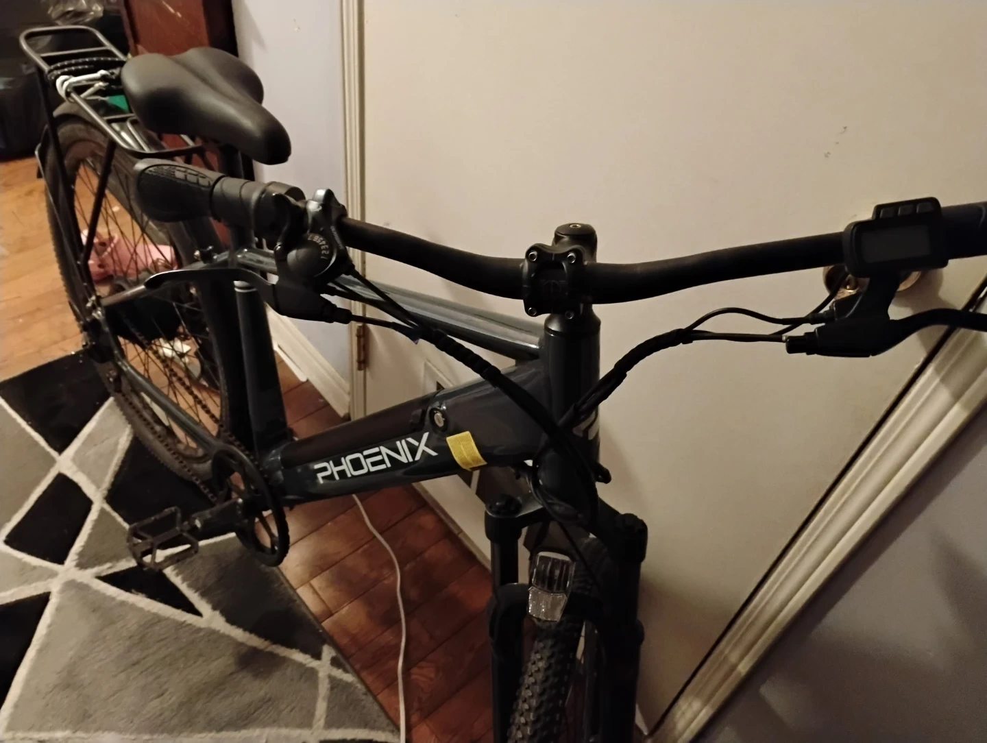 This is a Phoenix electric bicycle, great for getting around town or on trails. It's a sturdy bike with a powerful motor. The frame is made of durable aluminum.