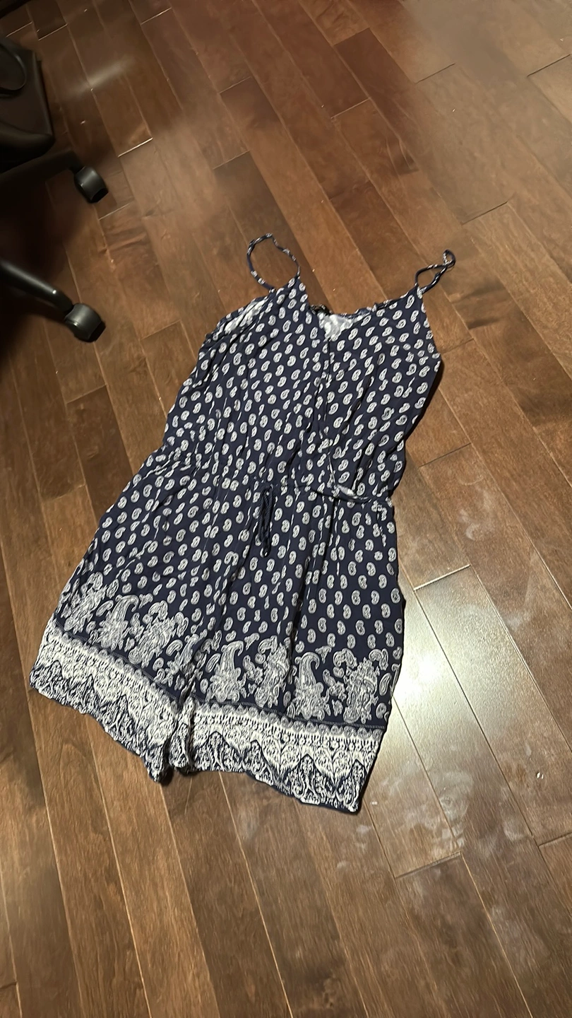 A navy blue romper with white paisley print and adjustable straps. The romper has an elastic waistband. It is a size 1X and measures 22 inches across the bust.