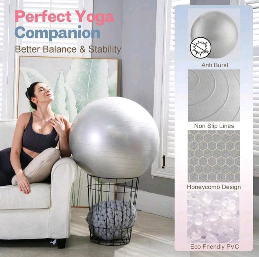 This anti-burst yoga ball is made from eco-friendly PVC. It includes a foot pump for inflation. Non-slip lines provide a honeycomb design for stability. It's recommended for better balance and stability.
