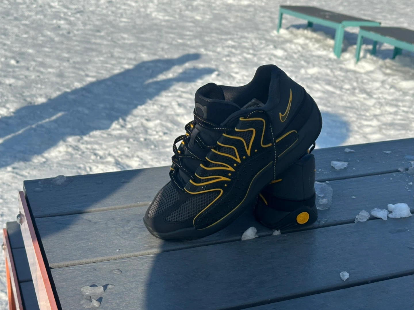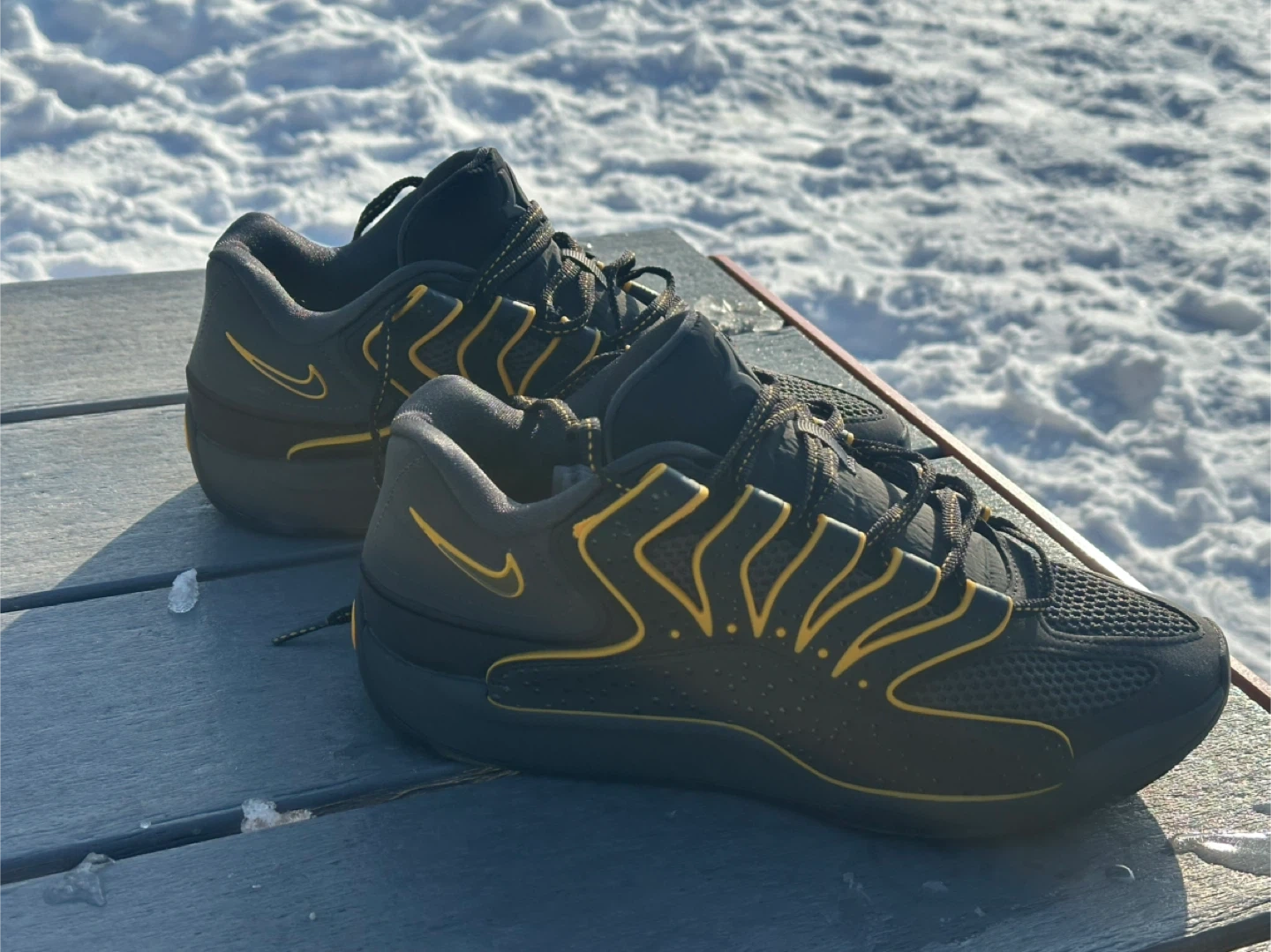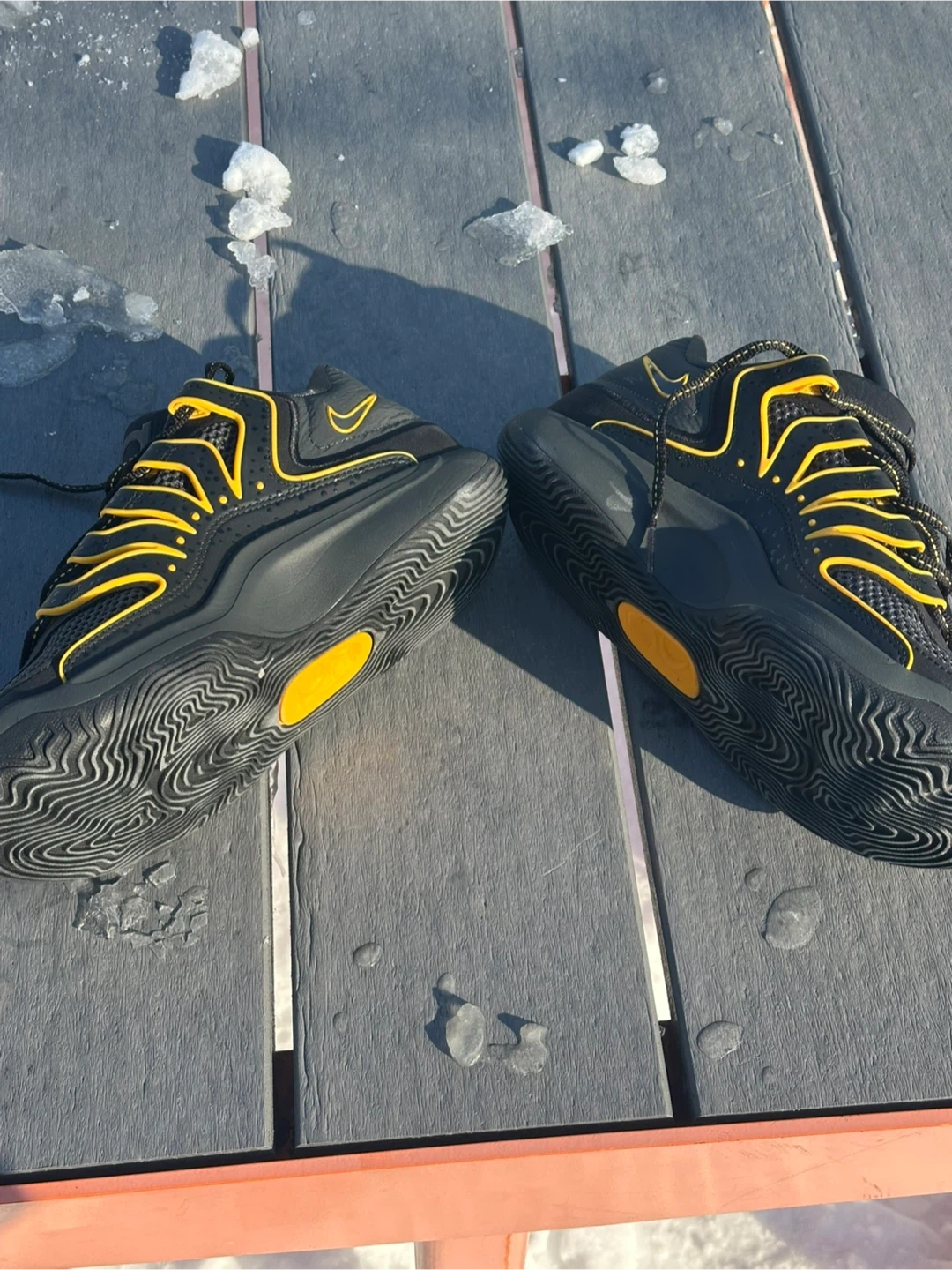These Nike KD 14 basketball shoes are black with yellow accents. They're built for performance on the court. Features a secure fit and supportive design for dynamic play.