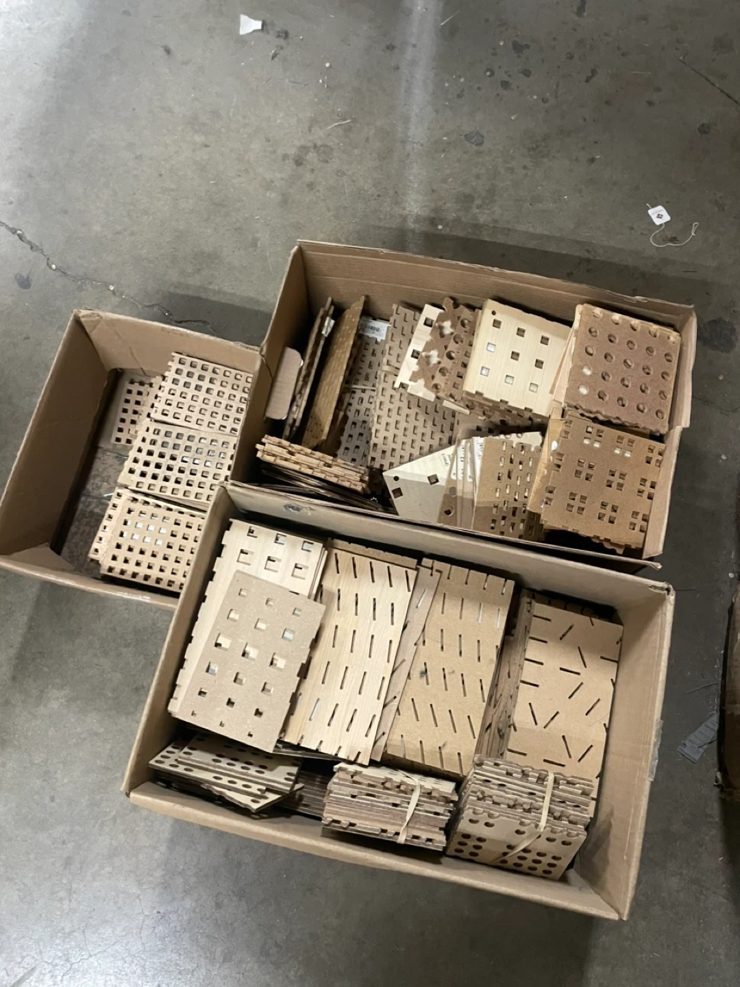 Bulk lot of unassembled laser-cut wooden pieces for crafting or building projects. Various intricate patterns and slot designs are present on the pieces. These are unassembled and ready for your creative assembly!