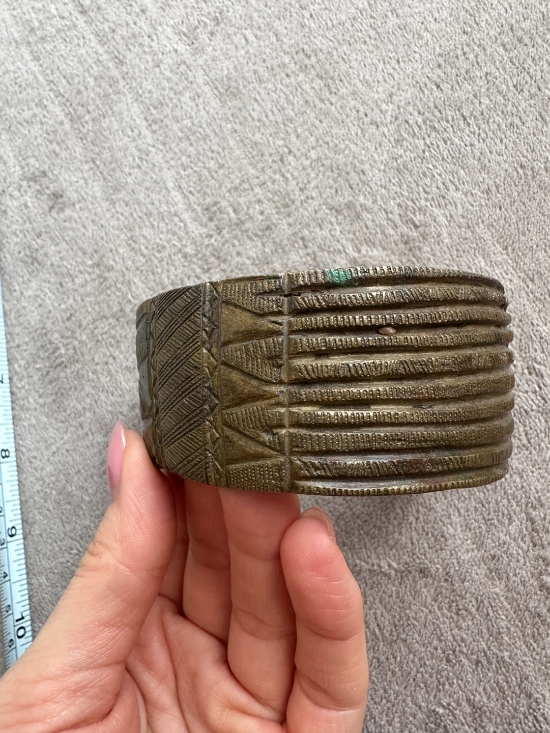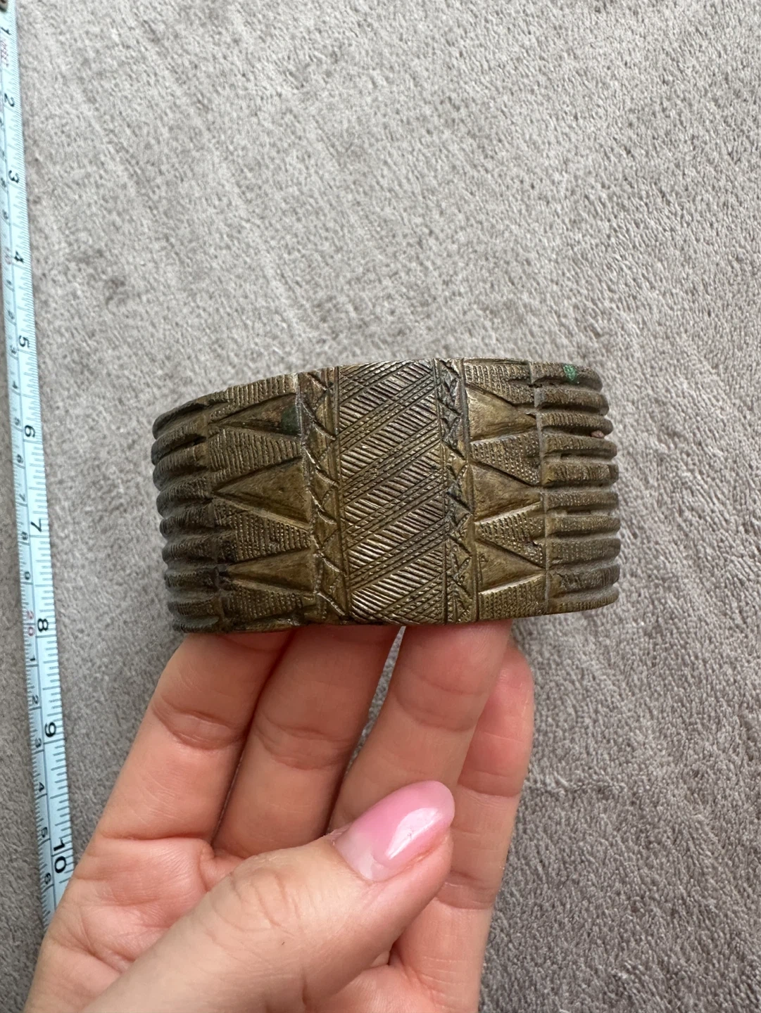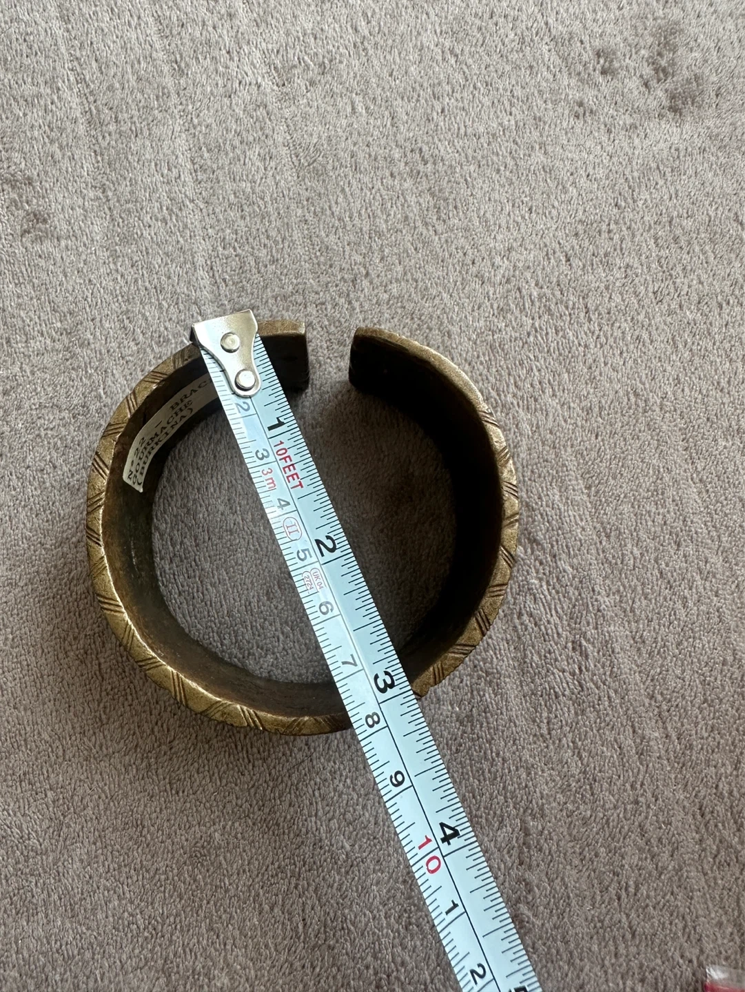 Unique African brass cuff bracelet with etched geometric patterns. Measures approximately 3 inches in diameter. It's a statement piece, perfect for adding a touch of tribal flair to any outfit!