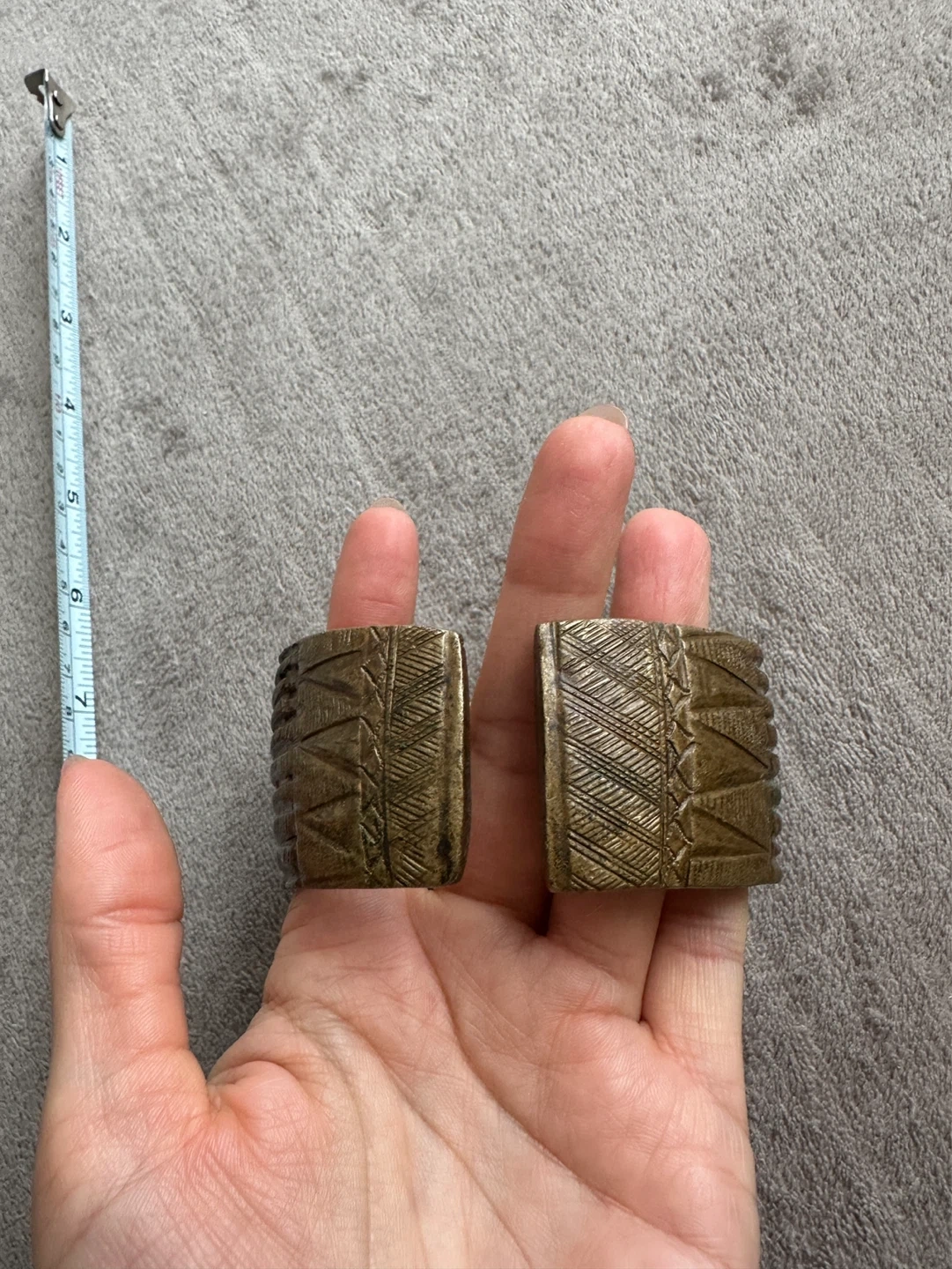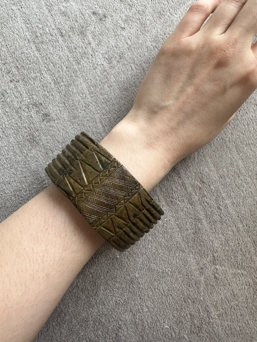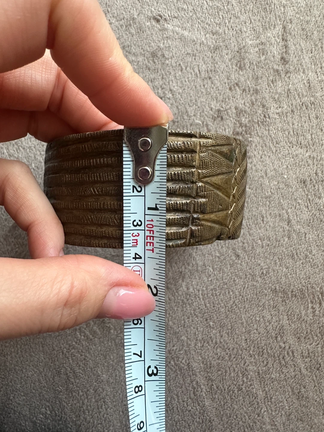 Unique African brass cuff bracelet with etched geometric patterns. Measures approximately 3 inches in diameter. It's a statement piece, perfect for adding a touch of tribal flair to any outfit!