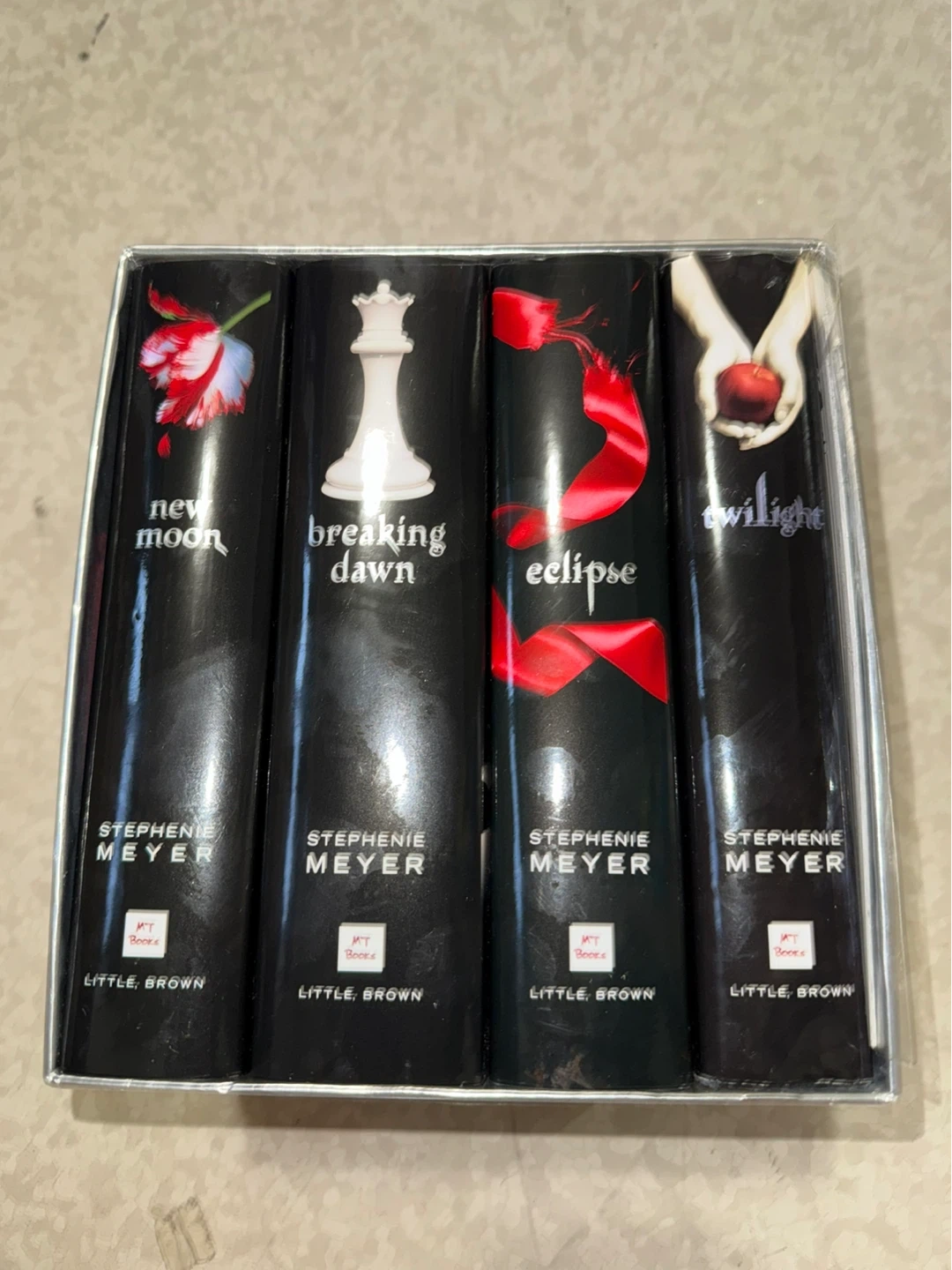 This is a box set of The Twilight Saga books by Stephenie Meyer. It includes Twilight, New Moon, Eclipse, and Breaking Dawn. All books are published by Little, Brown.