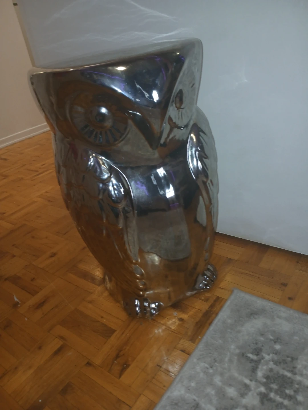 A decorative ceramic owl in a shiny silver finish. It's large enough to be used as a stool or a planter. This piece has a unique, eye-catching design.