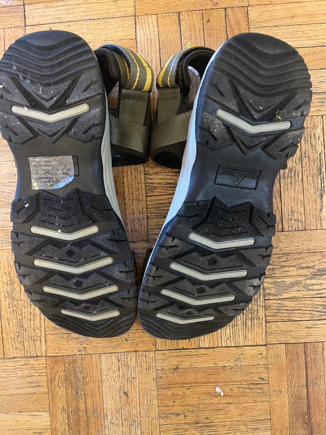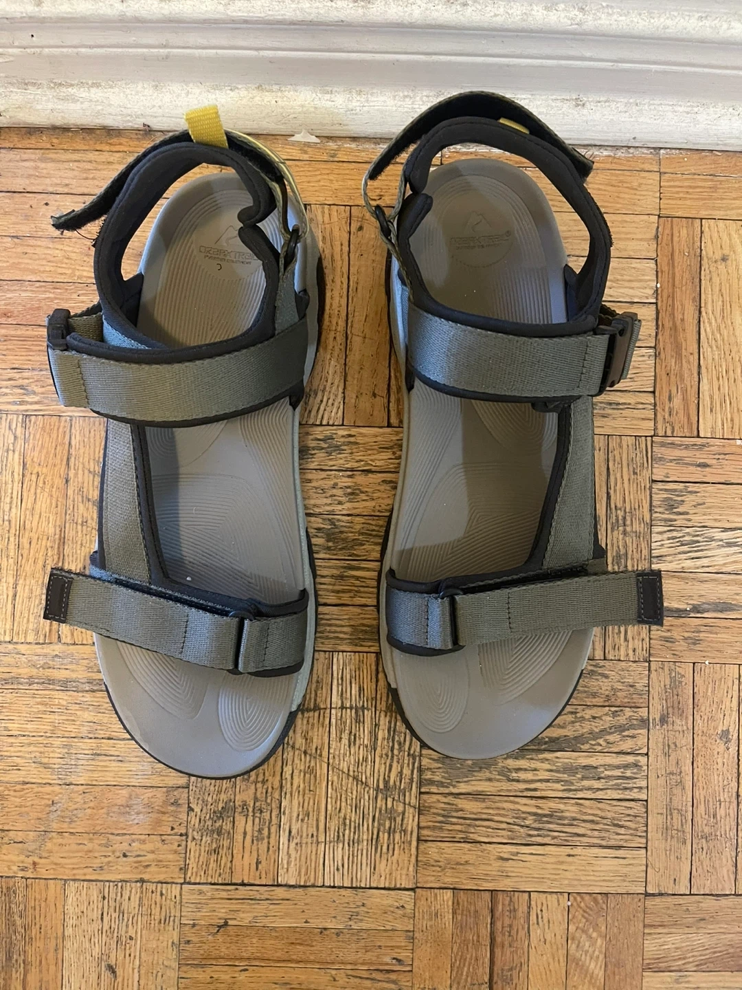 These are men's athletic sandals with adjustable straps. They have a durable rubber sole and a cushioned footbed. Great for hiking or casual wear in the summer!