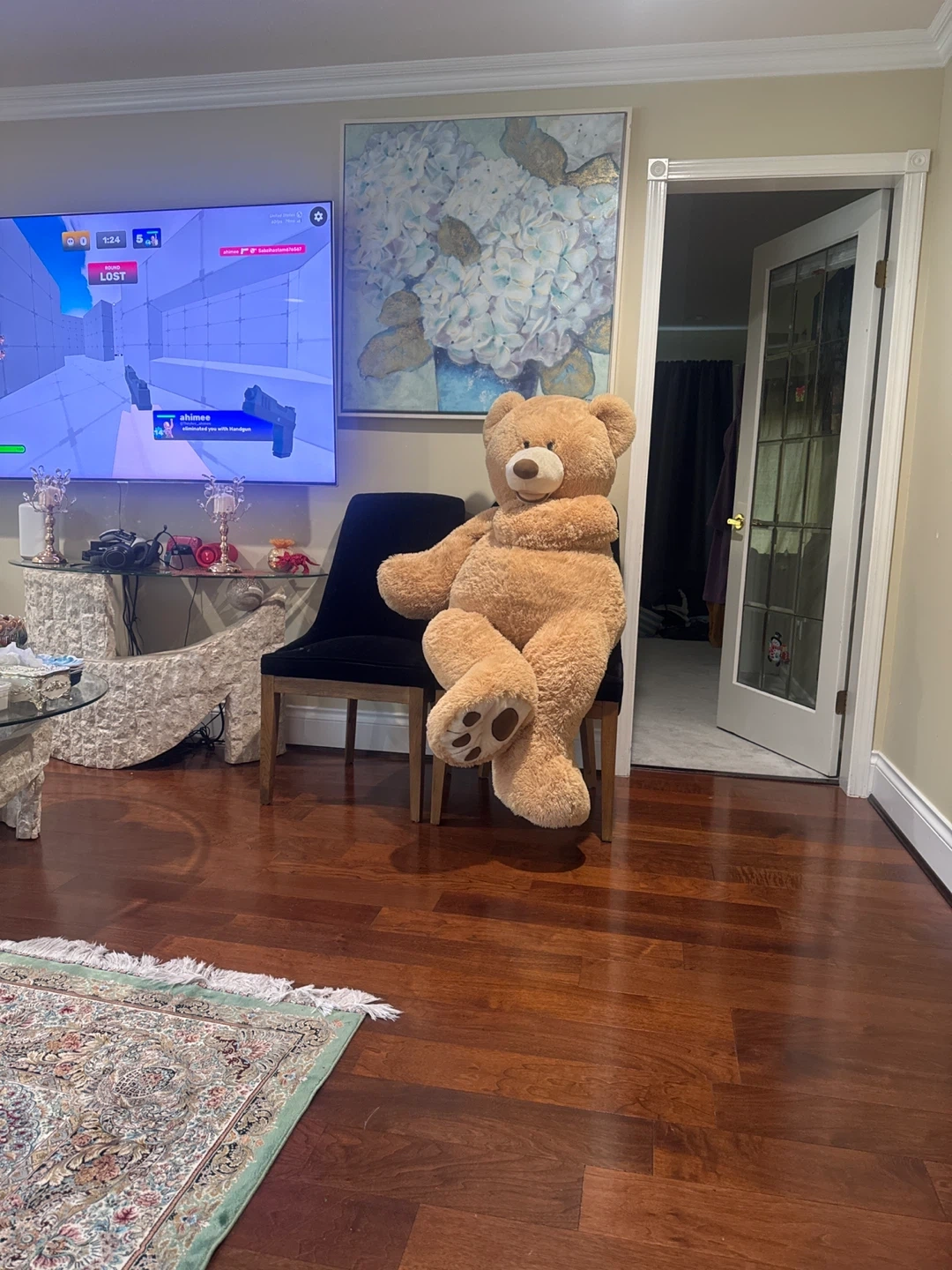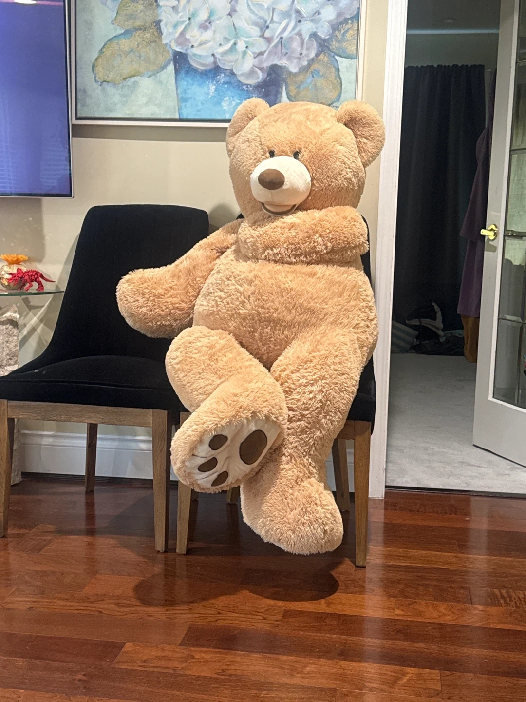 A very large, fluffy teddy bear! It's a light brown colour with a friendly face and paws. This big plush would make a fun cuddle buddy or a great statement piece in a room. It's perfect for surprising someone special!