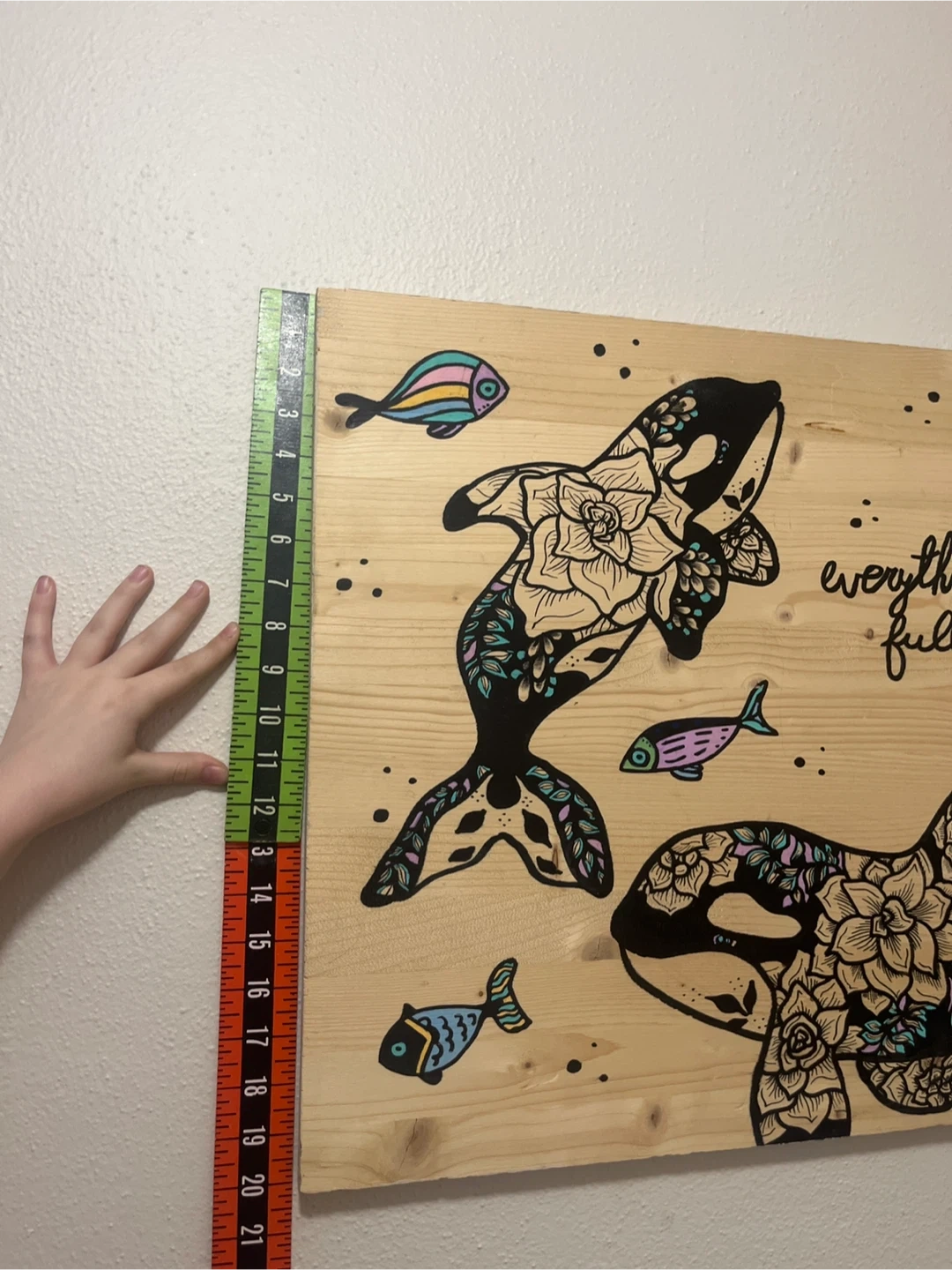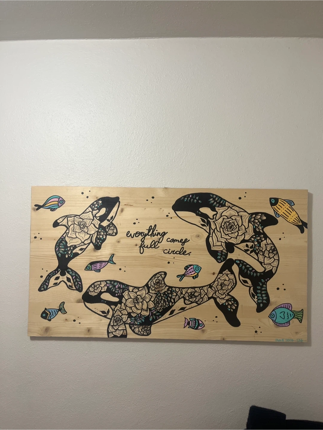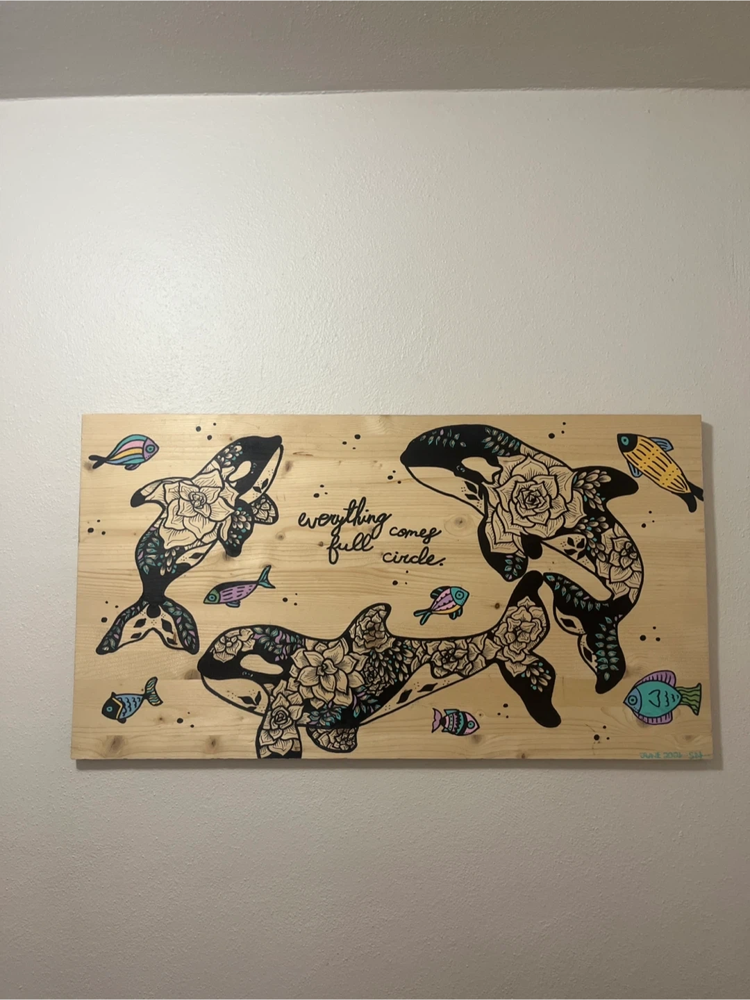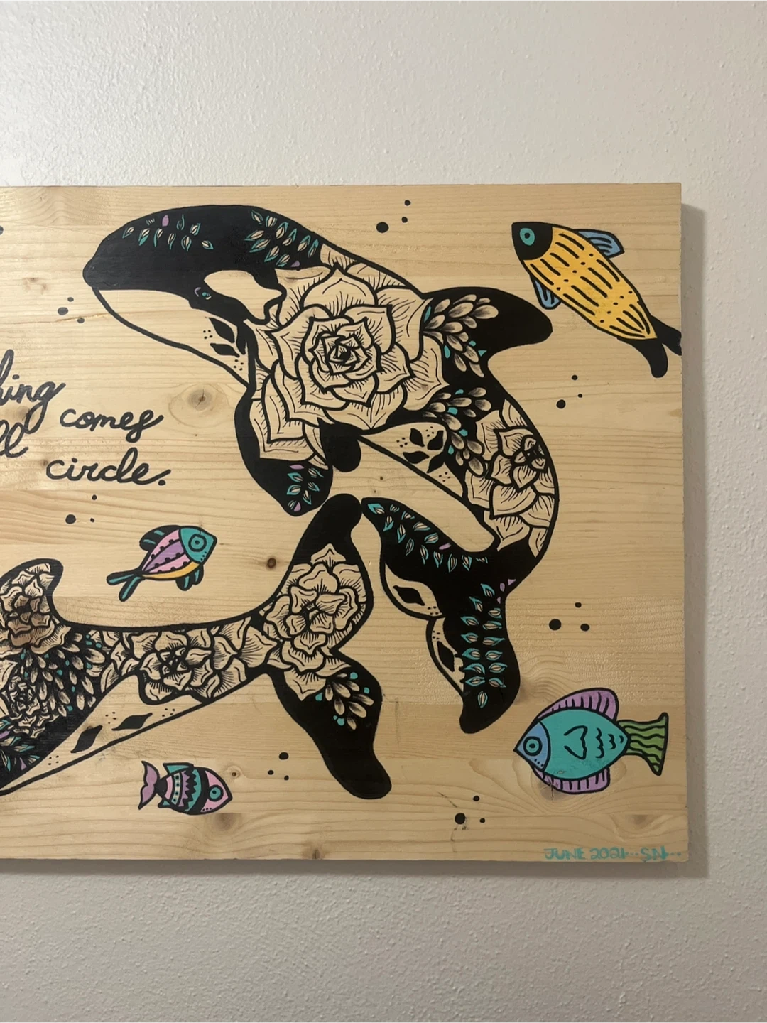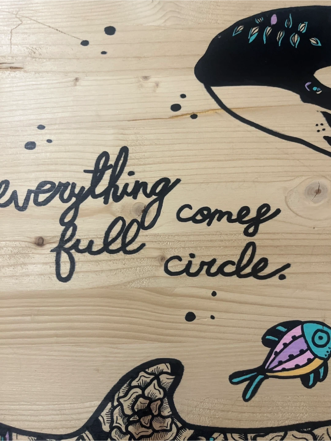 This wooden wall art features a beautiful illustration of orcas and fish, with the text "everything comes full circle". It's a unique piece of decor. The artwork is signed "JUNE 2021".