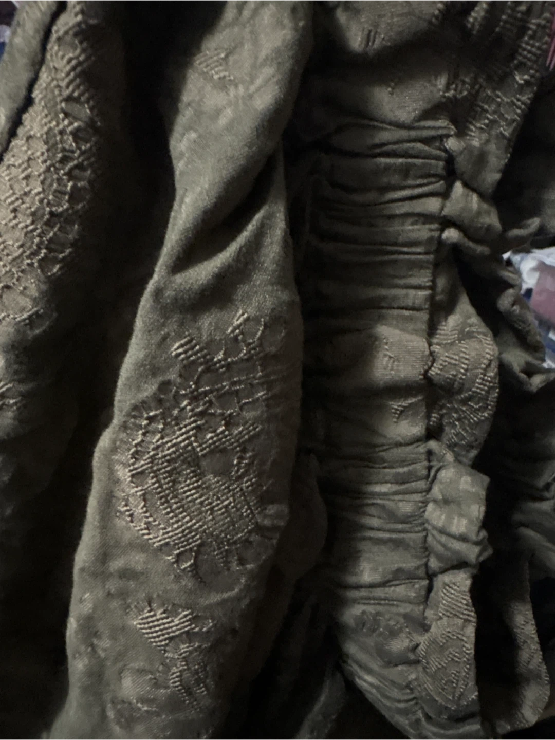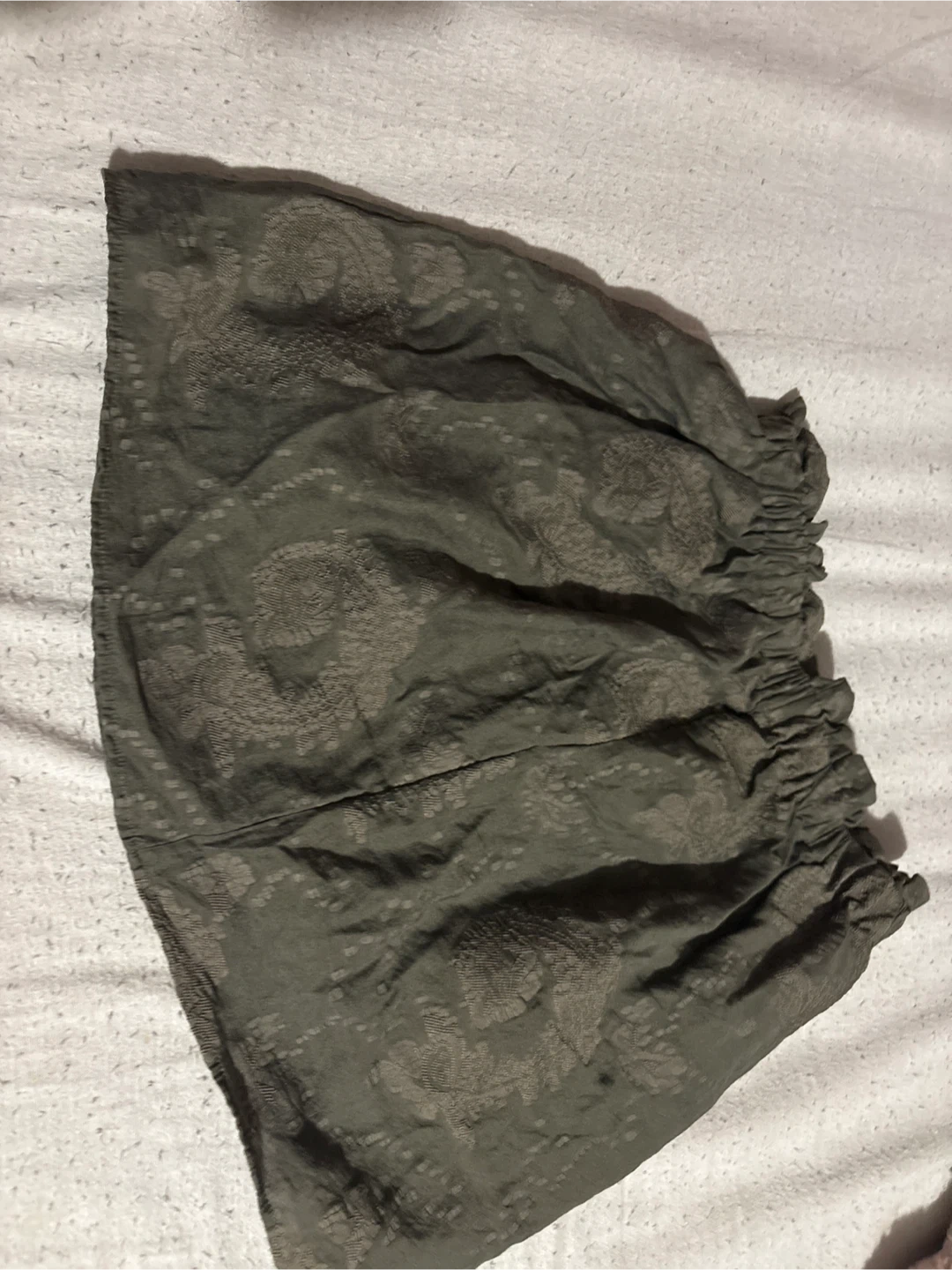 This olive green skirt features an elastic waistband for a comfortable fit. It has a patterned design throughout. The fabric appears to be a lightweight material.