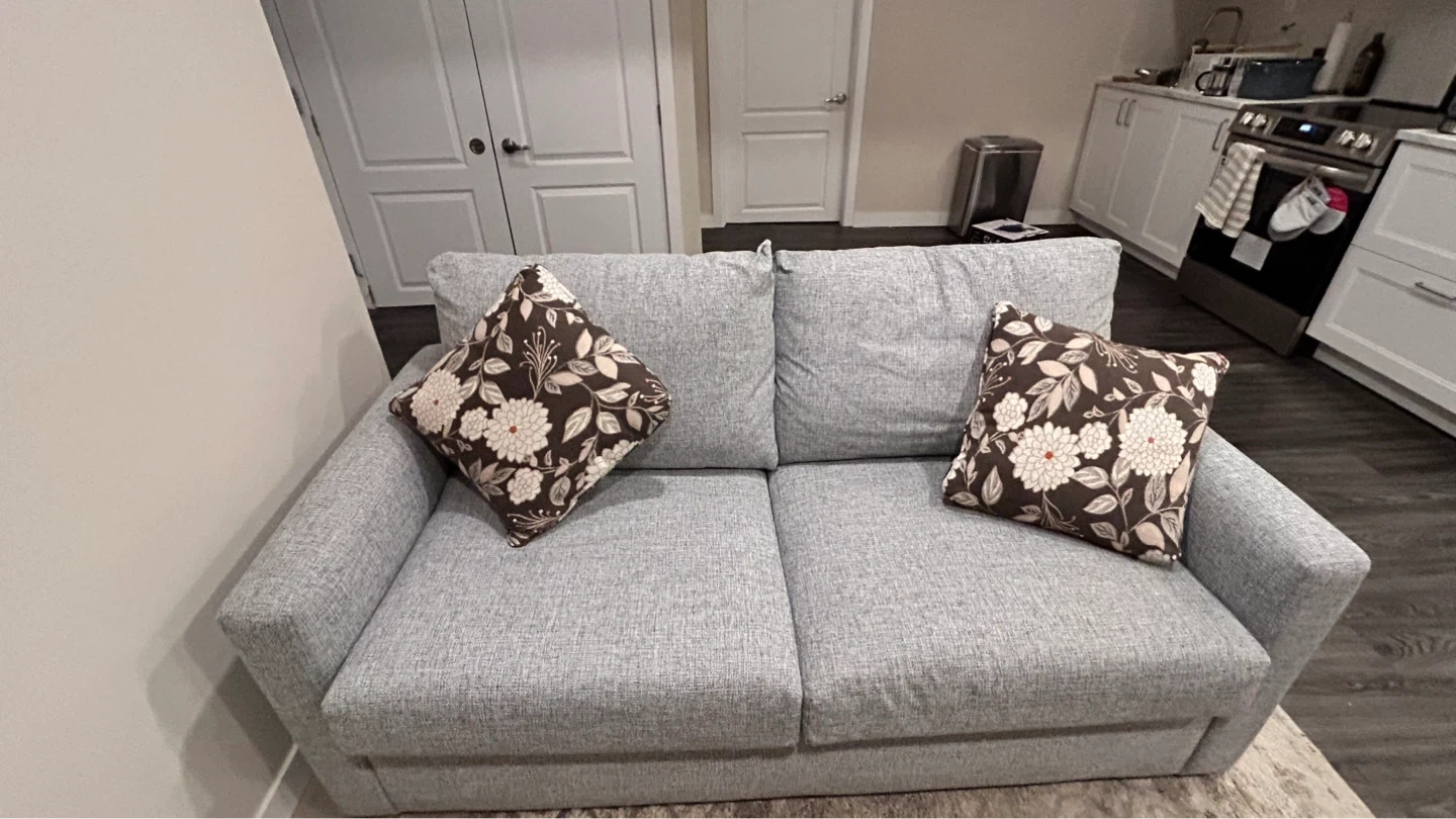 A grey sofa with a double pull-out mattress frame. Perfect for small spaces needing extra sleeping arrangements, simple to use, easy to set up and fold back, in great shape. Priced to sell fast.