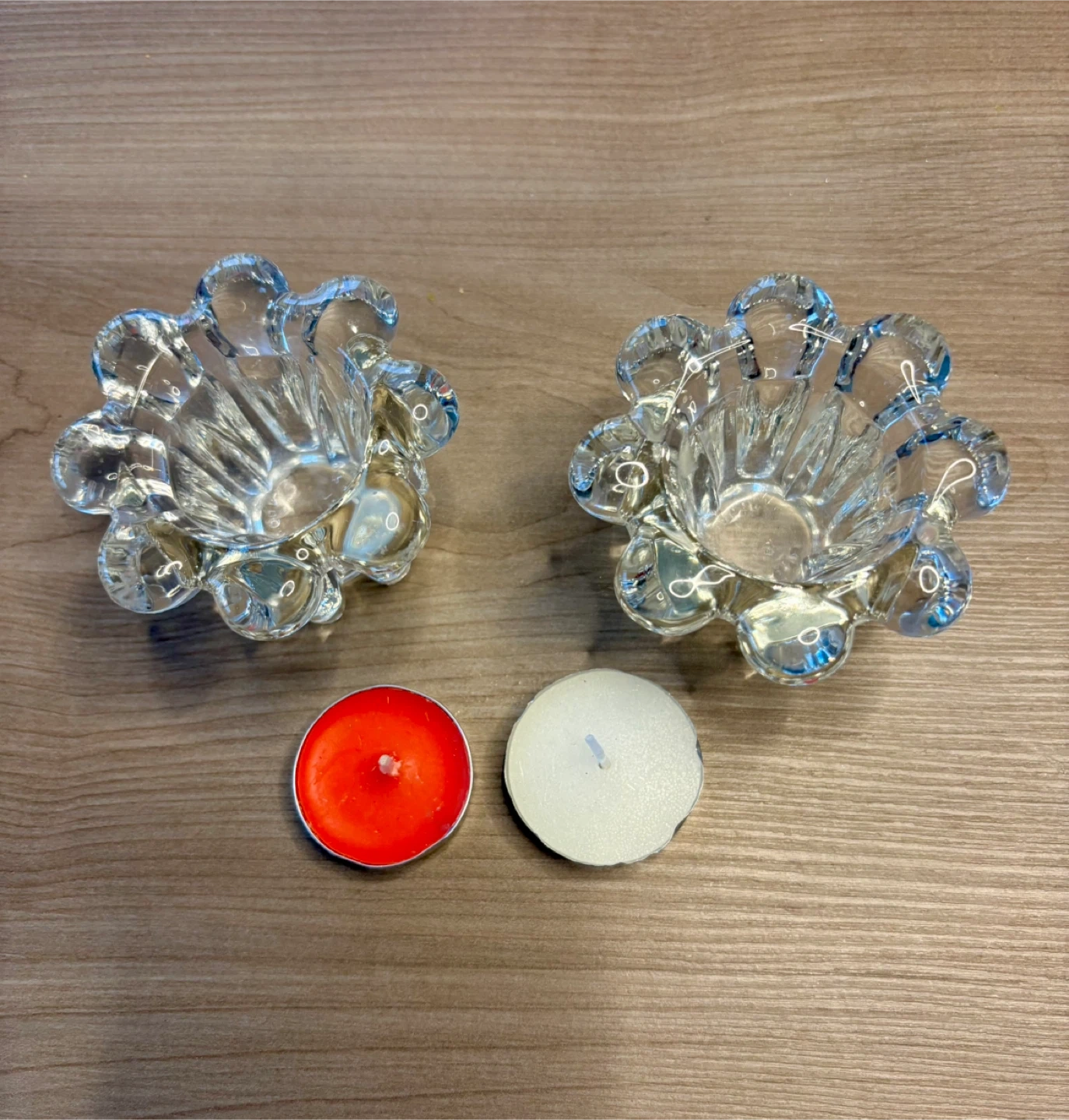Selling a set of two clear glass flower-shaped tea light candle holders. They're in great condition and ready to add a touch of cozy to your space! Comes with two tea light candles in the photos.