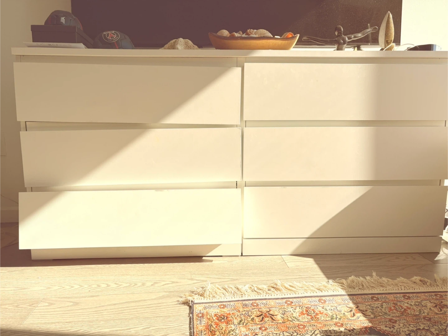 This is a white dresser with six drawers. It's made of a particleboard or composite material. The dresser offers ample storage space.