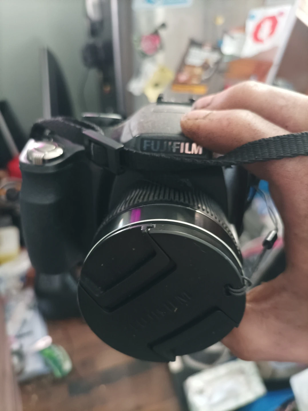 This is a Fujifilm digital camera with a built-in lens. It's black and comes with a strap and lens cap. Great for casual photography!