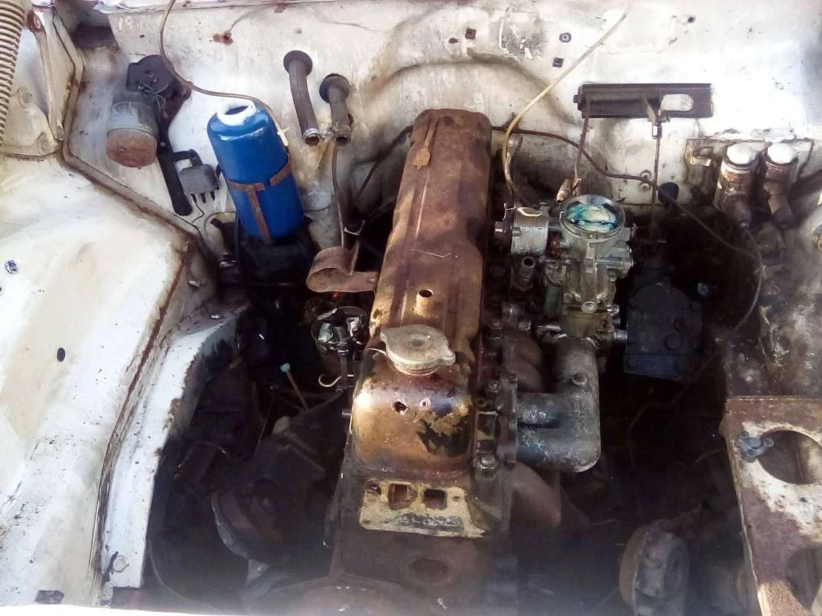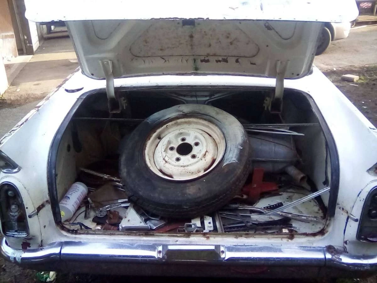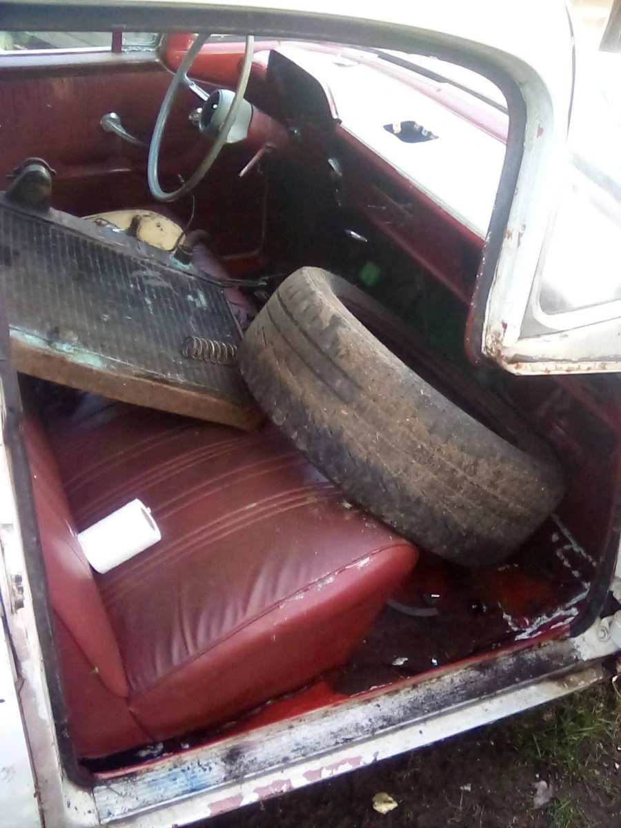 This is a vintage Vauxhall Velox 4-door sedan. It's a classic car project, showing signs of its age. The interior is partially dismantled with seats and various car parts visible. The engine bay contains the engine, carburetor, and some associated components.