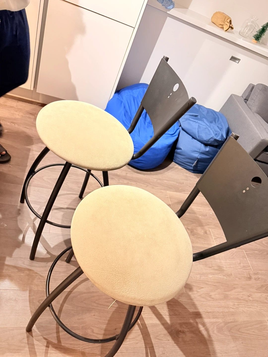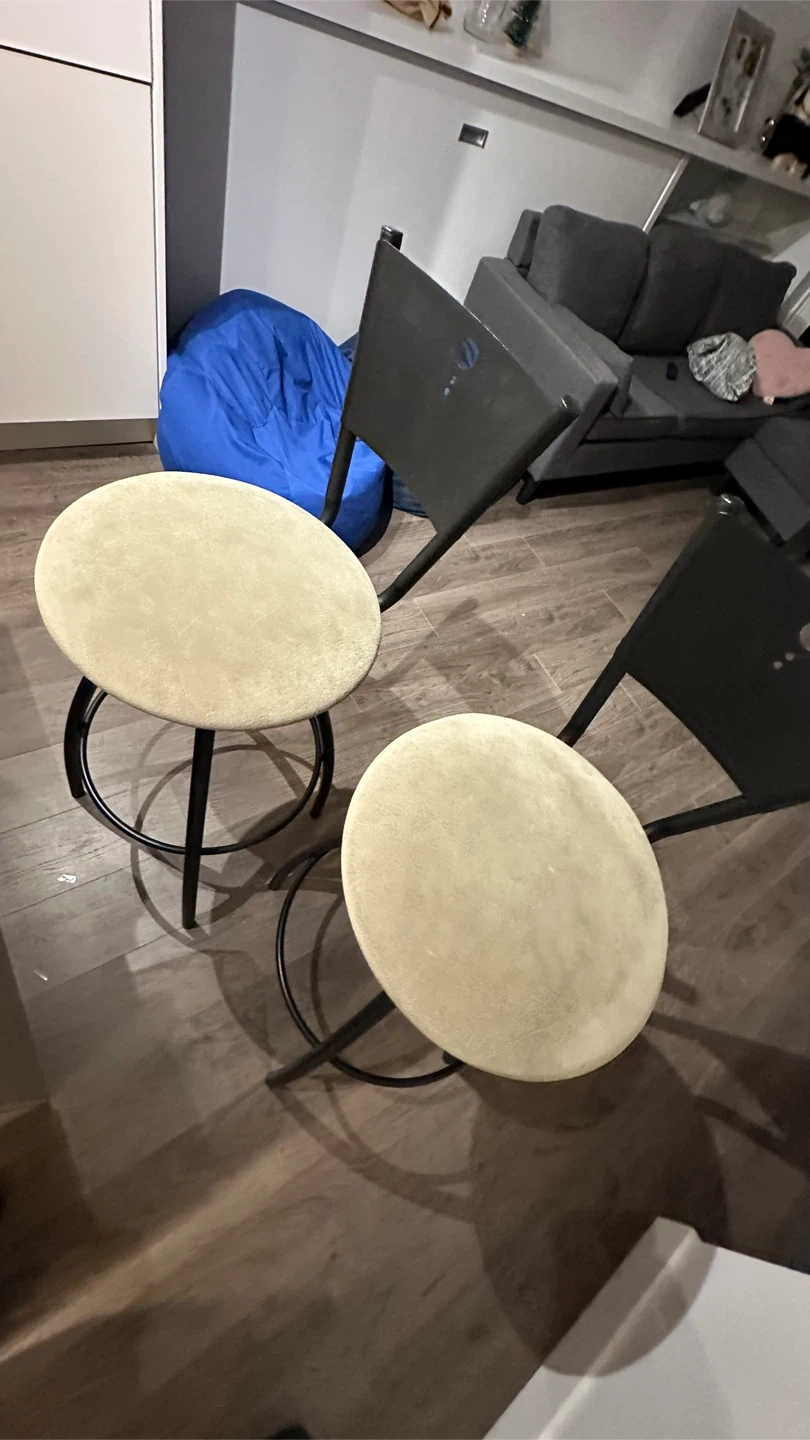 Two bar stools with cream-coloured upholstered seats and black metal frames. These stools feature a swivel function for easy movement. The metal footrests provide added comfort.
