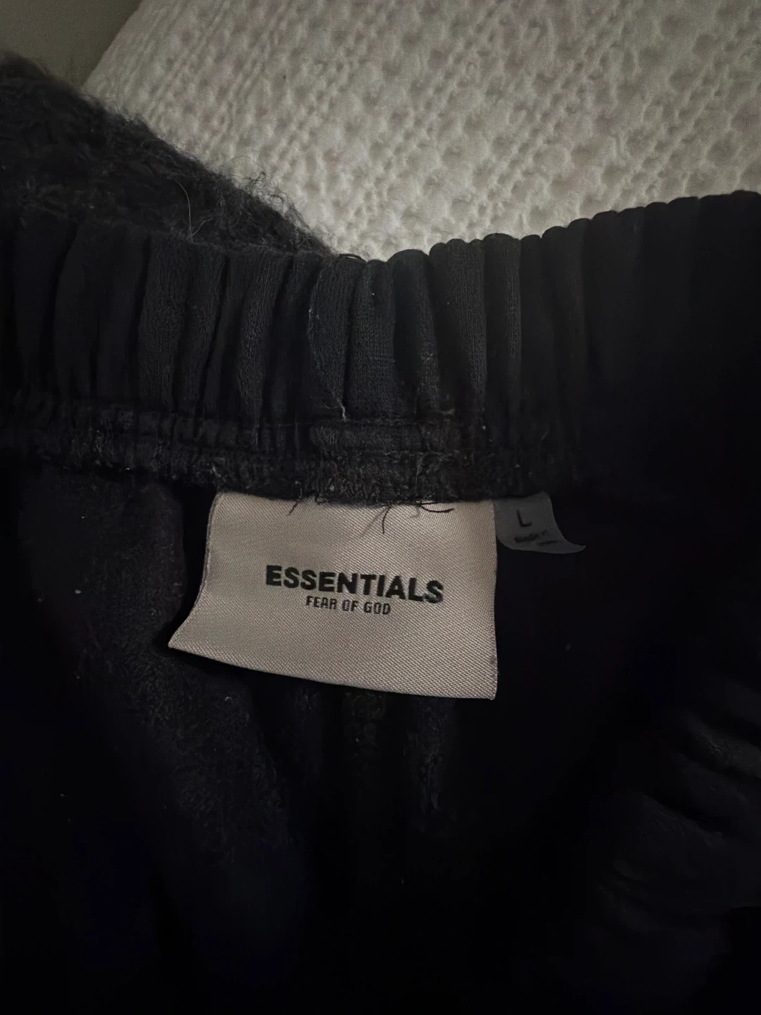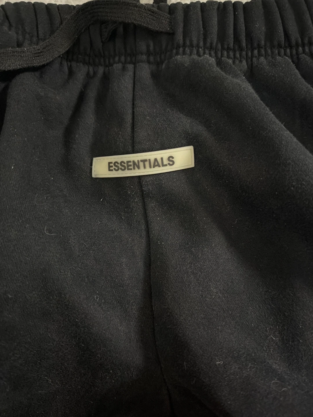 This is a black reflective Essentials hoodie and sweatpants set. The hoodie has a front pocket and drawstring hood. The sweatpants are also black with a drawstring waist. Both pieces are made from a comfortable material, perfect for casual wear.