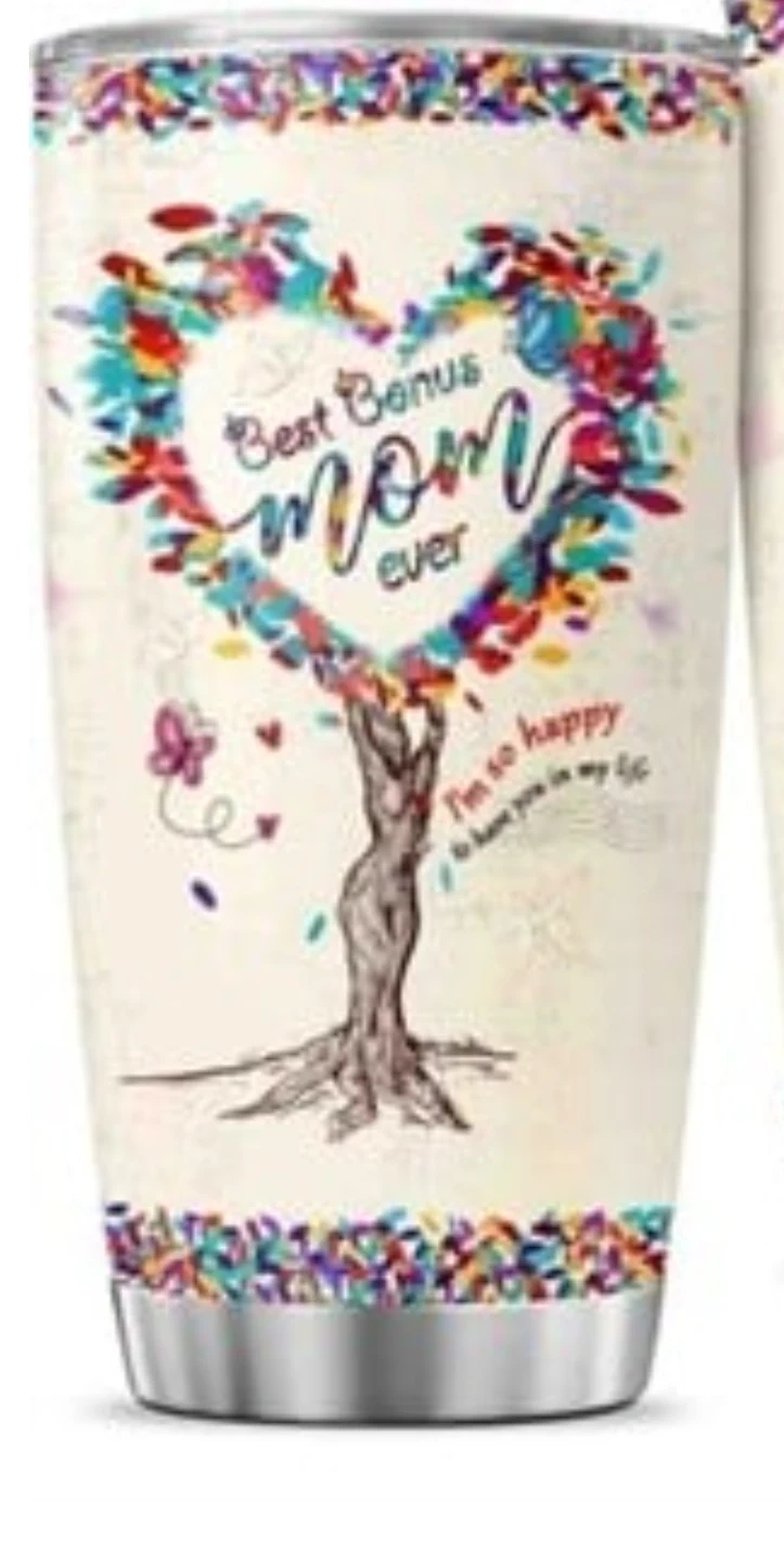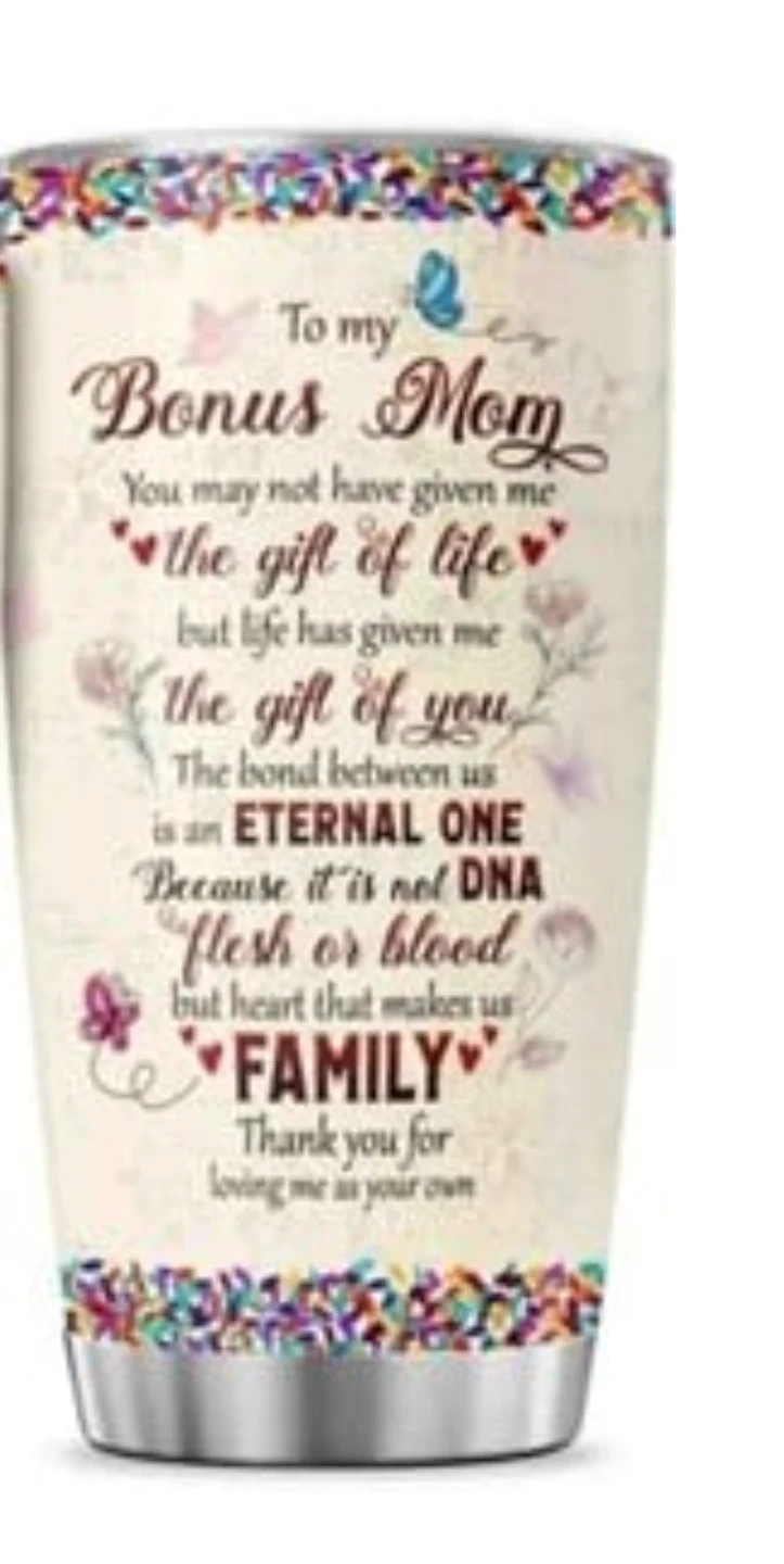 This stainless steel tumbler is a thoughtful gift for a bonus mom. It features a "Best Bonus Mom Ever" design with a heartfelt message. Keeps drinks hot or cold!