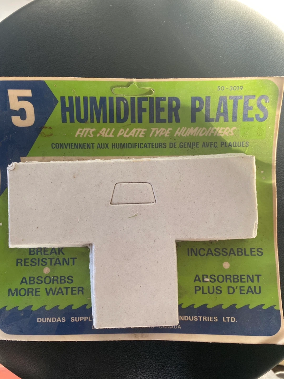 Package of 5 humidifier plates that fit all plate-type humidifiers. They're break-resistant and absorb more water. Manufactured by Dundas Supplies Industries Ltd. in Canada.