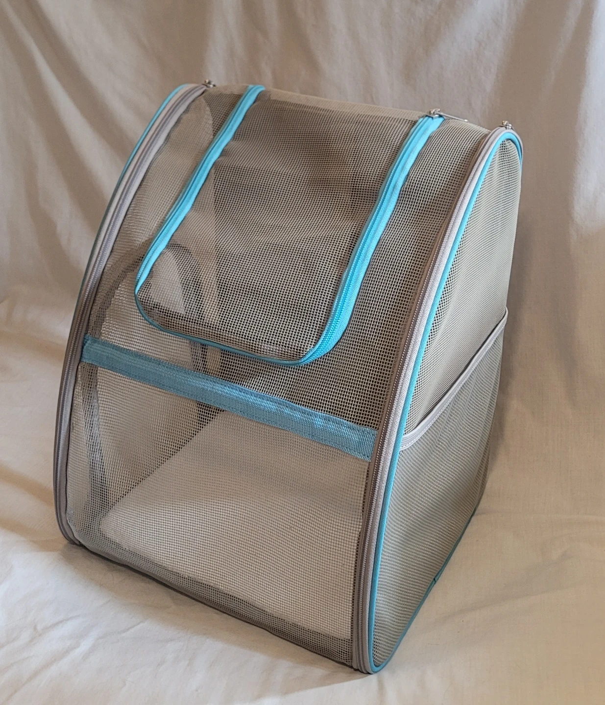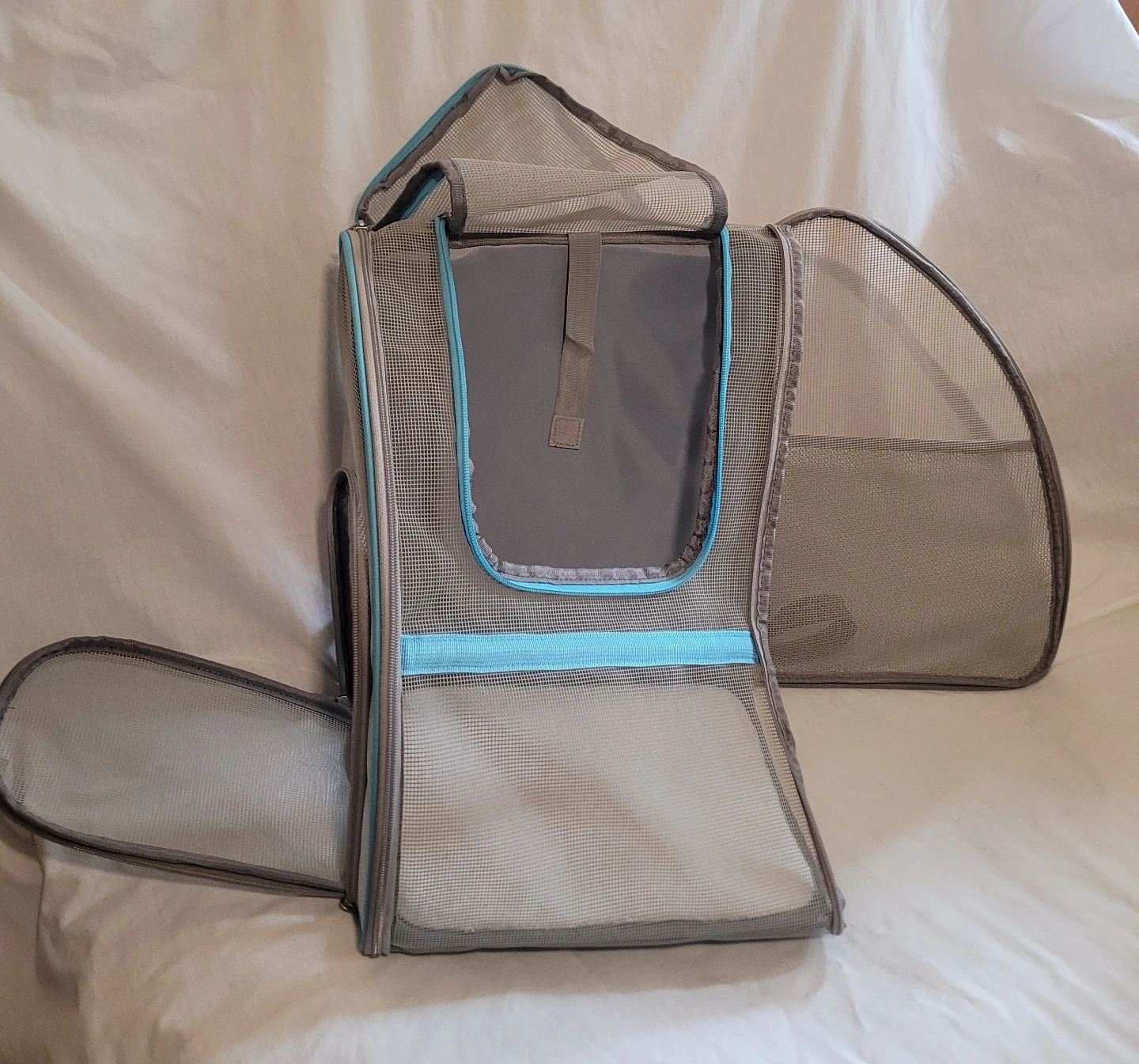 Mesh pet carrier bag with zippers. Features breathable mesh sides for ventilation. It has top and side openings for easy pet access.