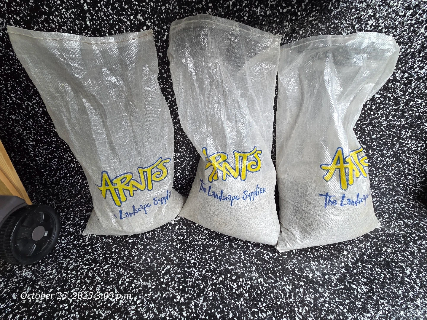 603 small bags of lime stone screening gravel for driveway or interlocking stone patios.
