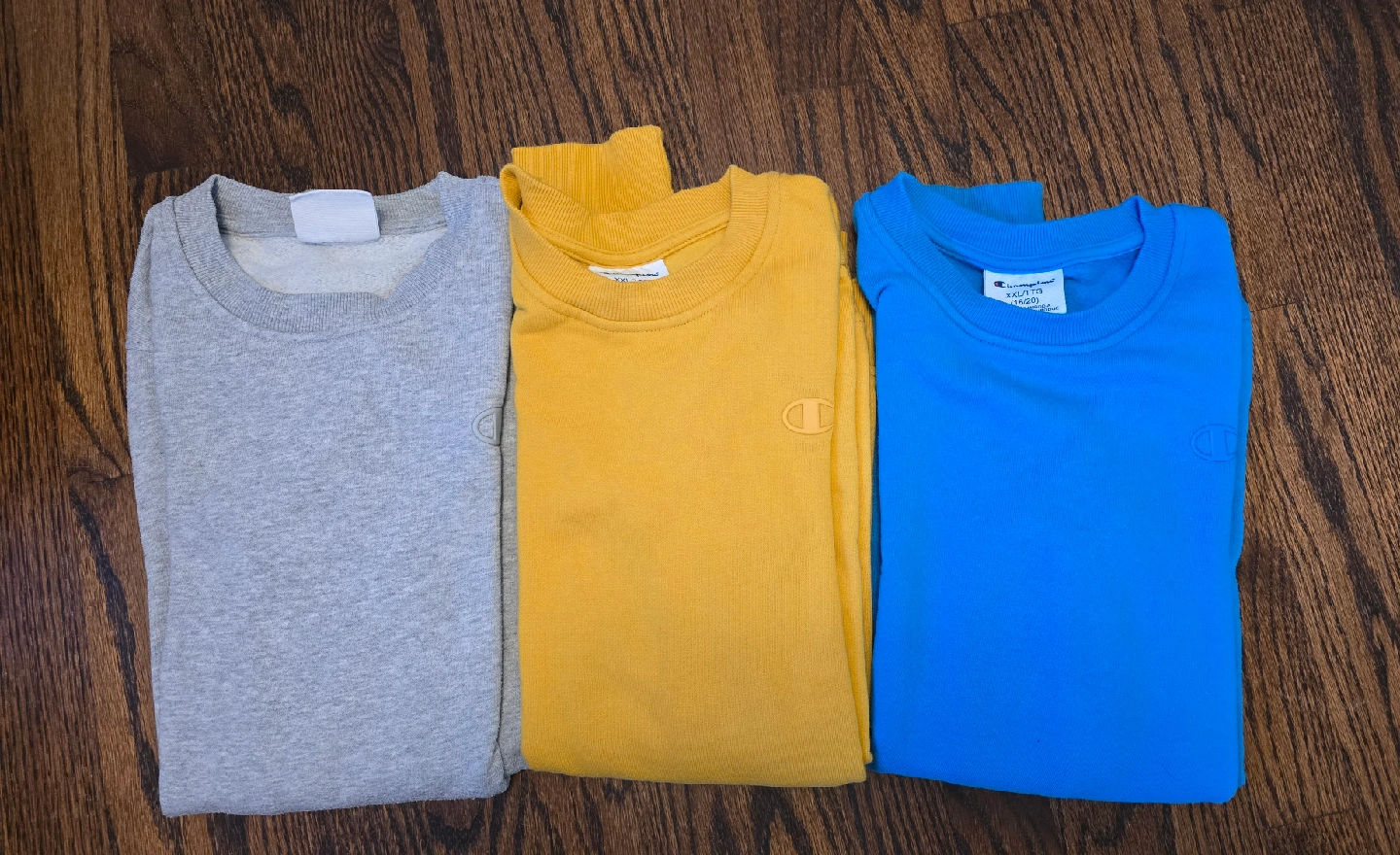 142Selling a bundle of three Champion crewneck sweatshirts! In excellent condition, like new my son wore them just once. Size 14years. They come in grey, yellow, and blue. Each one features the classic Champion logo on the chest and sleeve. Great for casual wear or layering up!